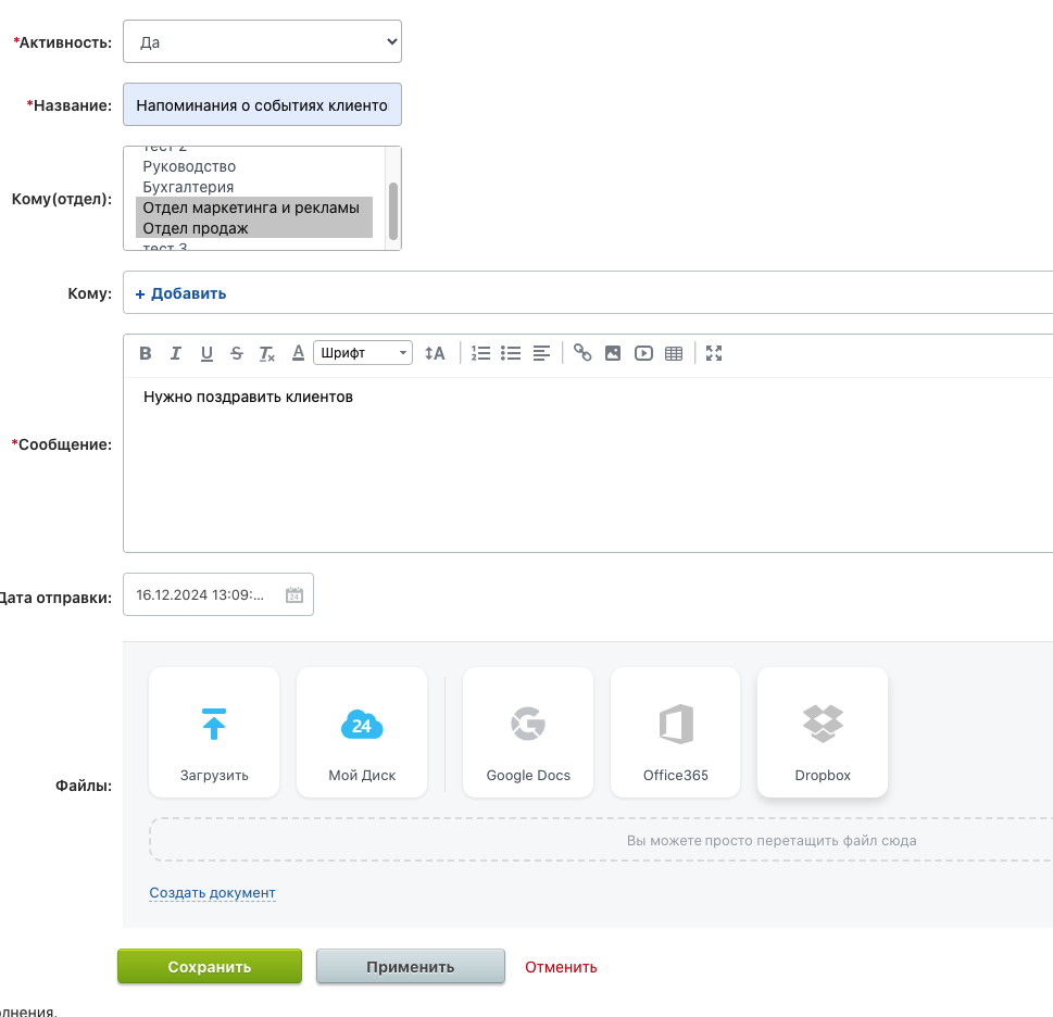 Выберите адресатов. Это может быть отдел или конкретные сотрудники. Если оставить поля с получателями пустыми, сообщение отправится на всех сотрудников портала.