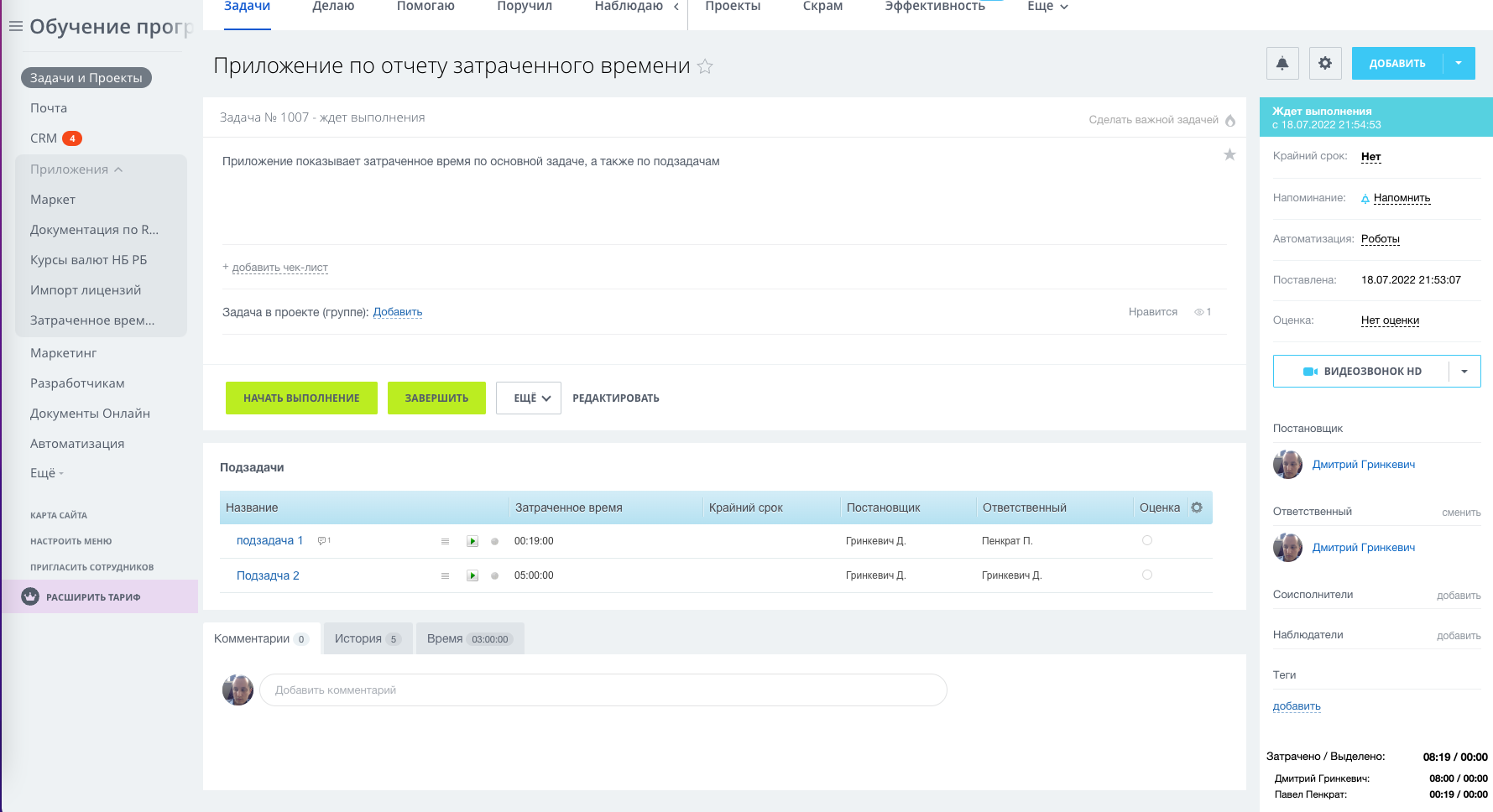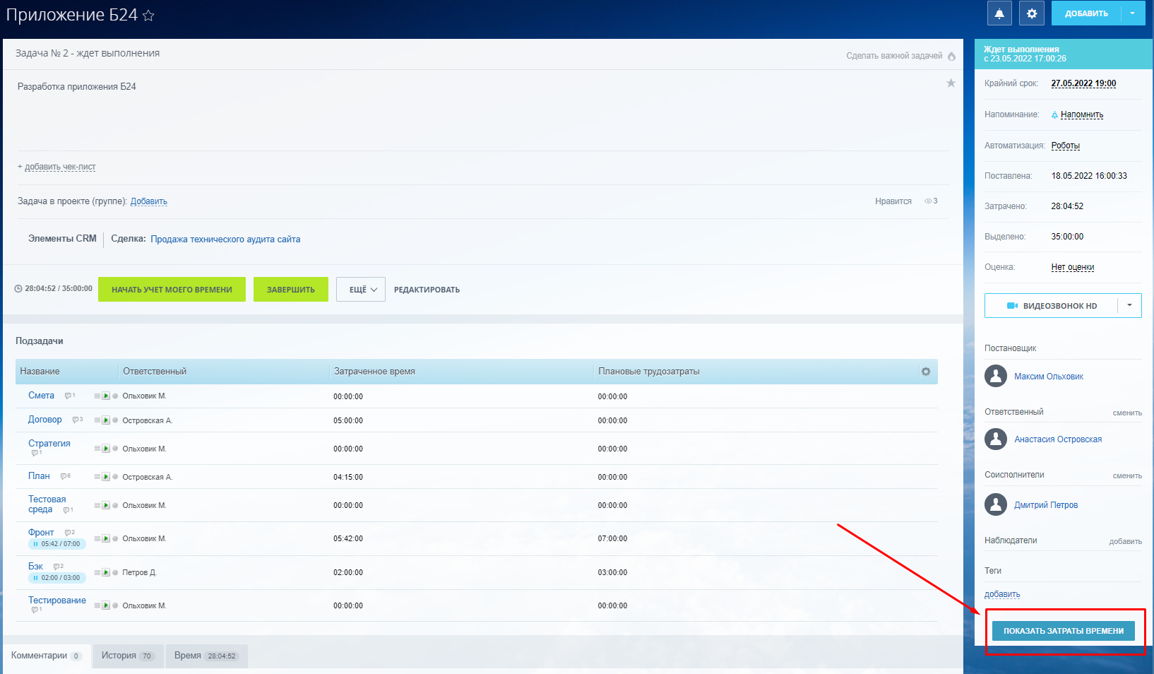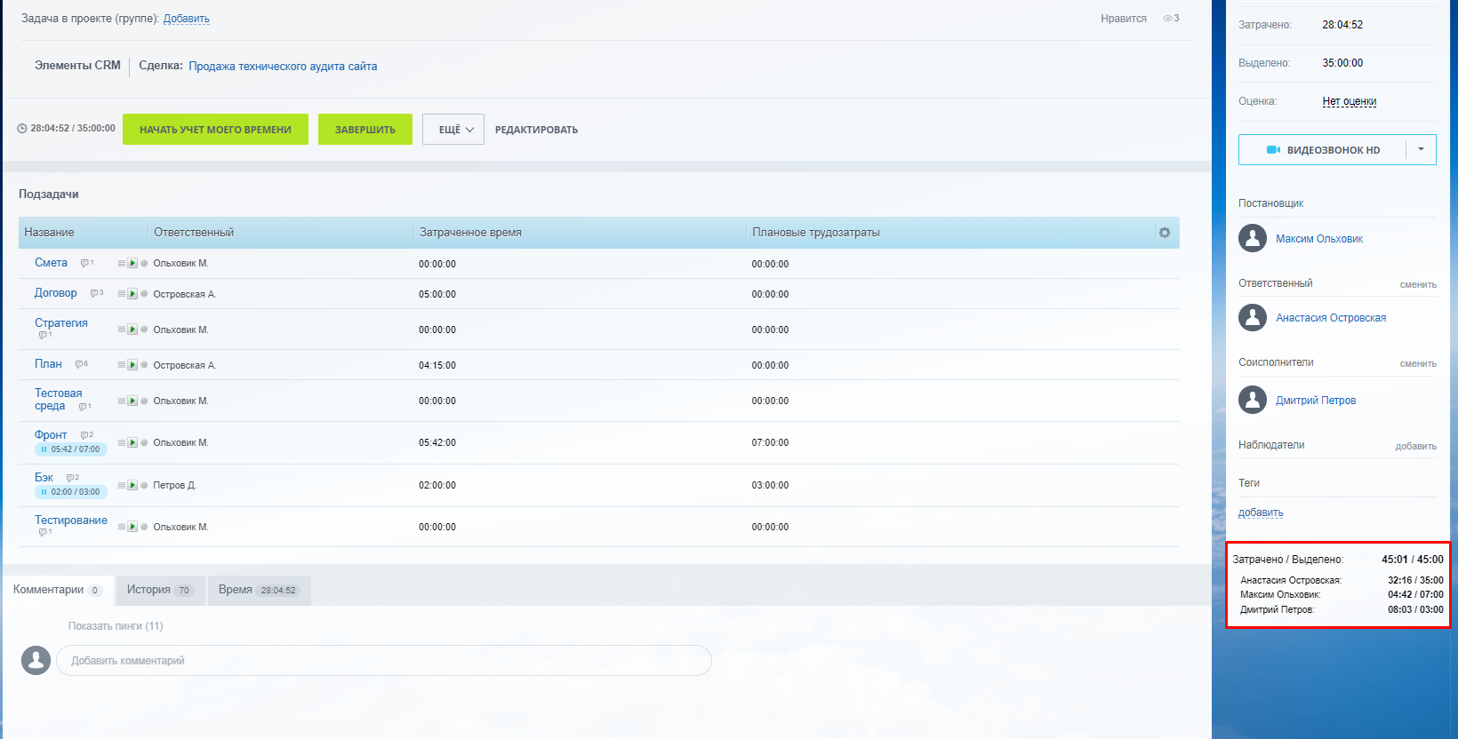 Подробный учёт времени по сотрудникам: Получайте детализированную информацию о времени, которое затратил каждый сотрудник в задаче.