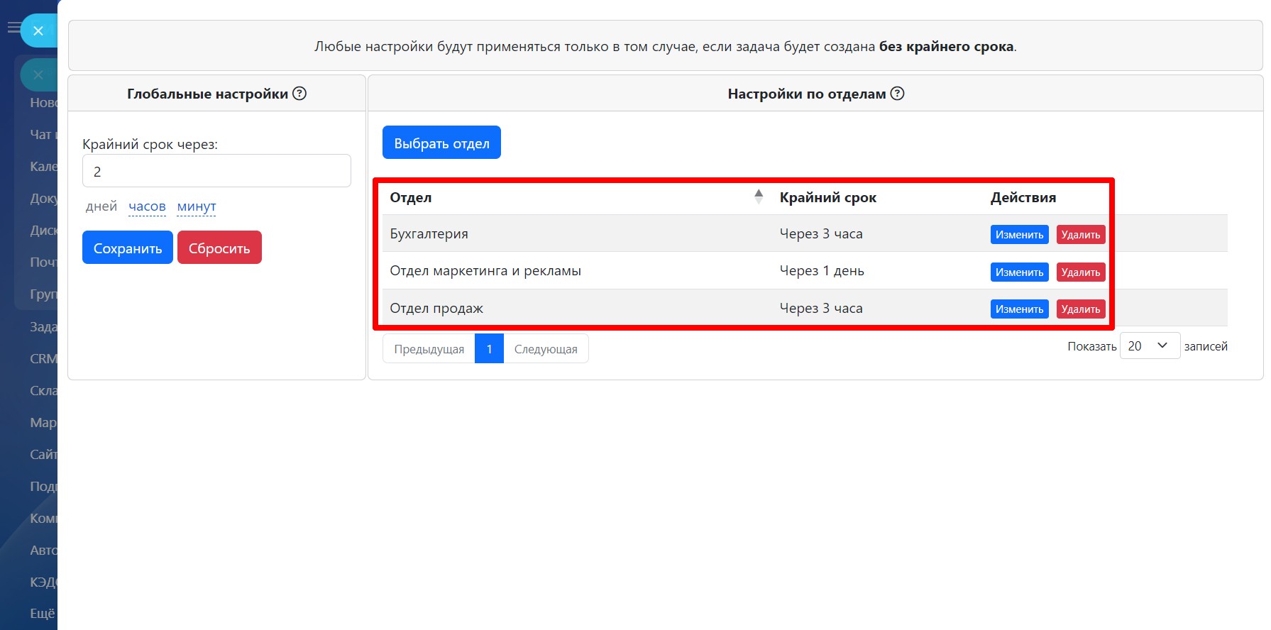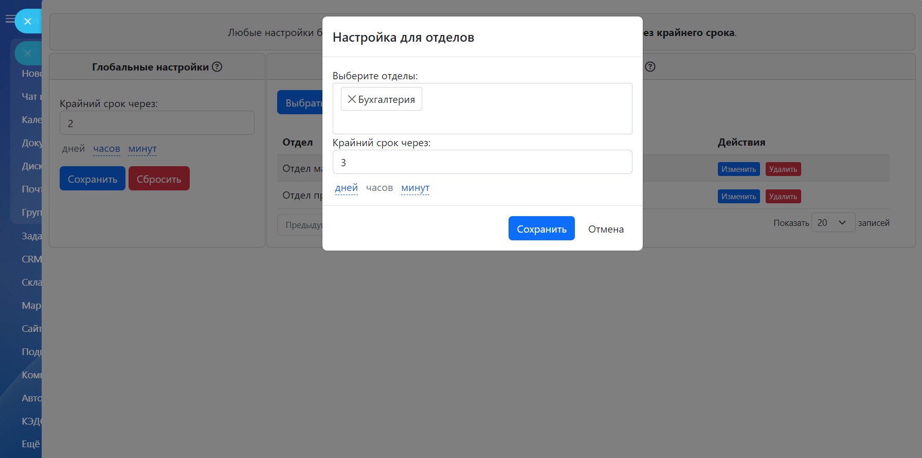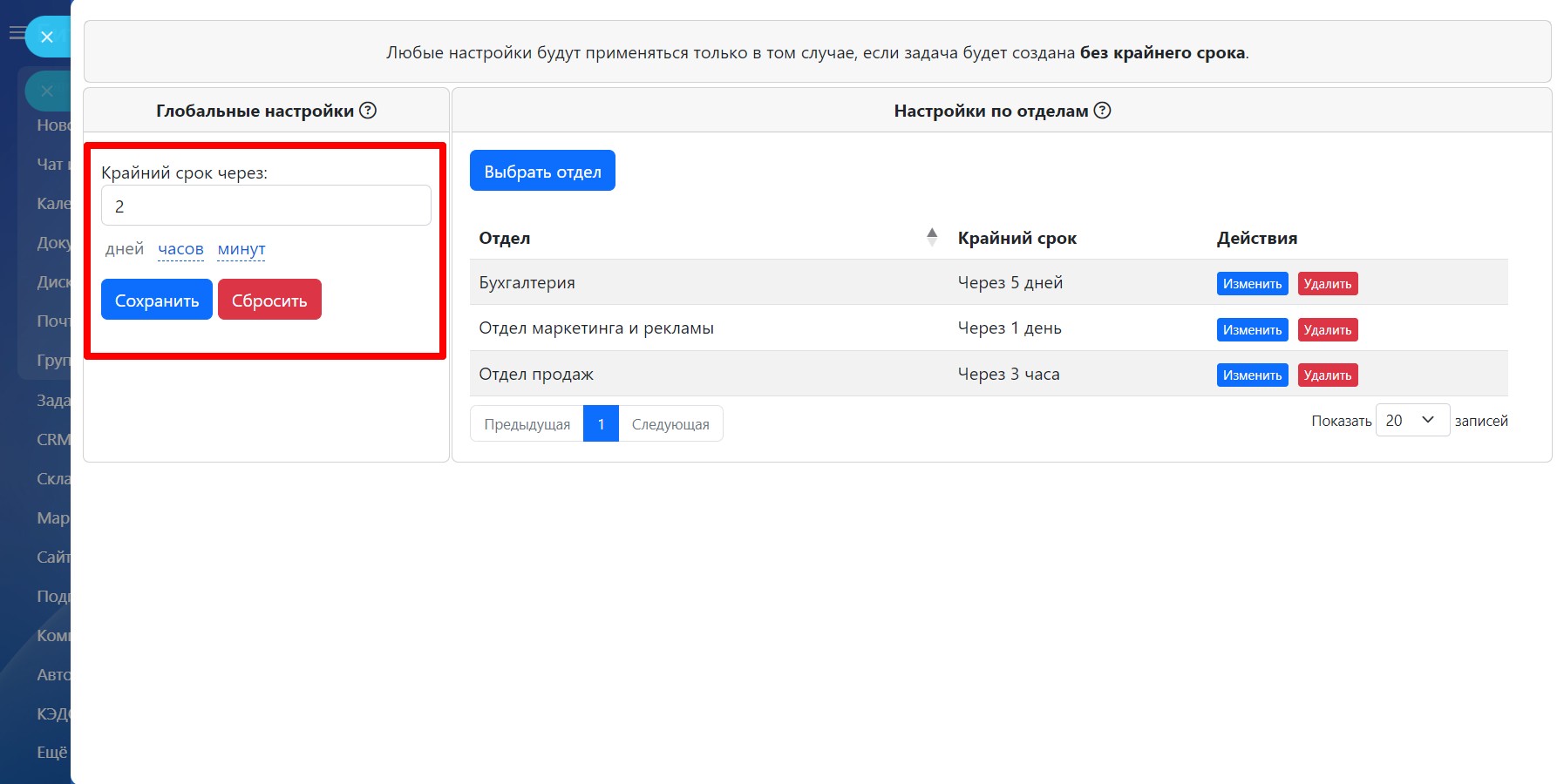 Если вы хотите настроить общий крайний срок для всех отделов, то установите его в блоке "Глобальные настройки"