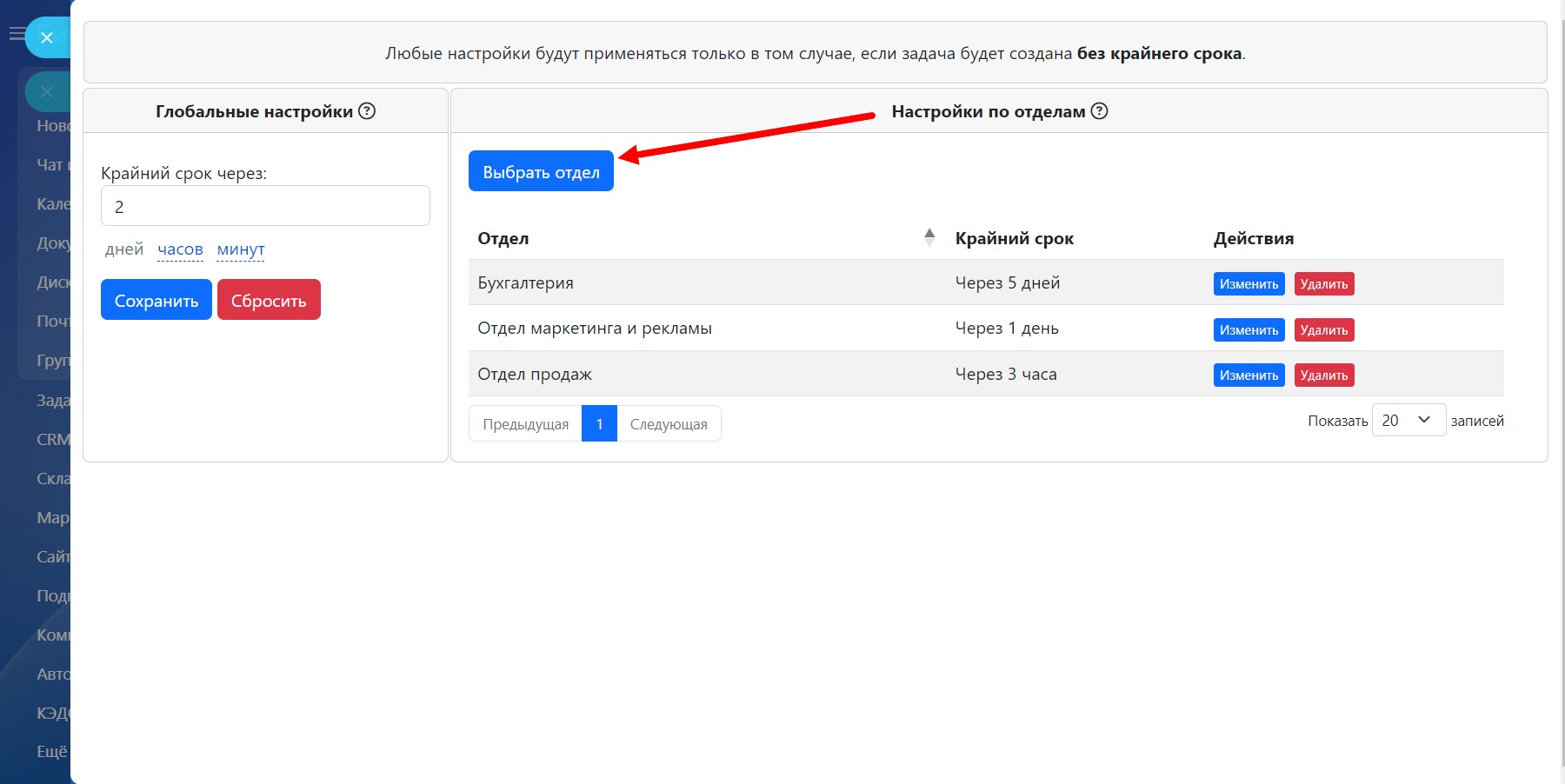 Если вы хотите установить отдельный крайний срок на какой-то отдел, то в блоке "Настройки по отделам" нажимаем "Выбрать отдел"