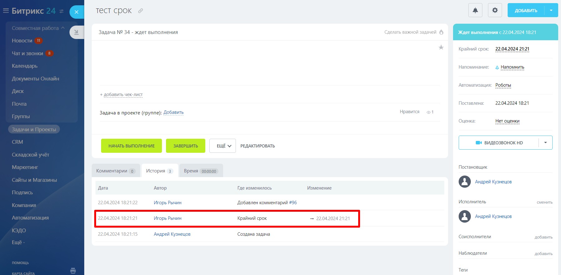Ставим задачу без крайнего срока на сотрудника из этого отдела и видим, что срок задачи изменился на +3 часа от даты создания задачи