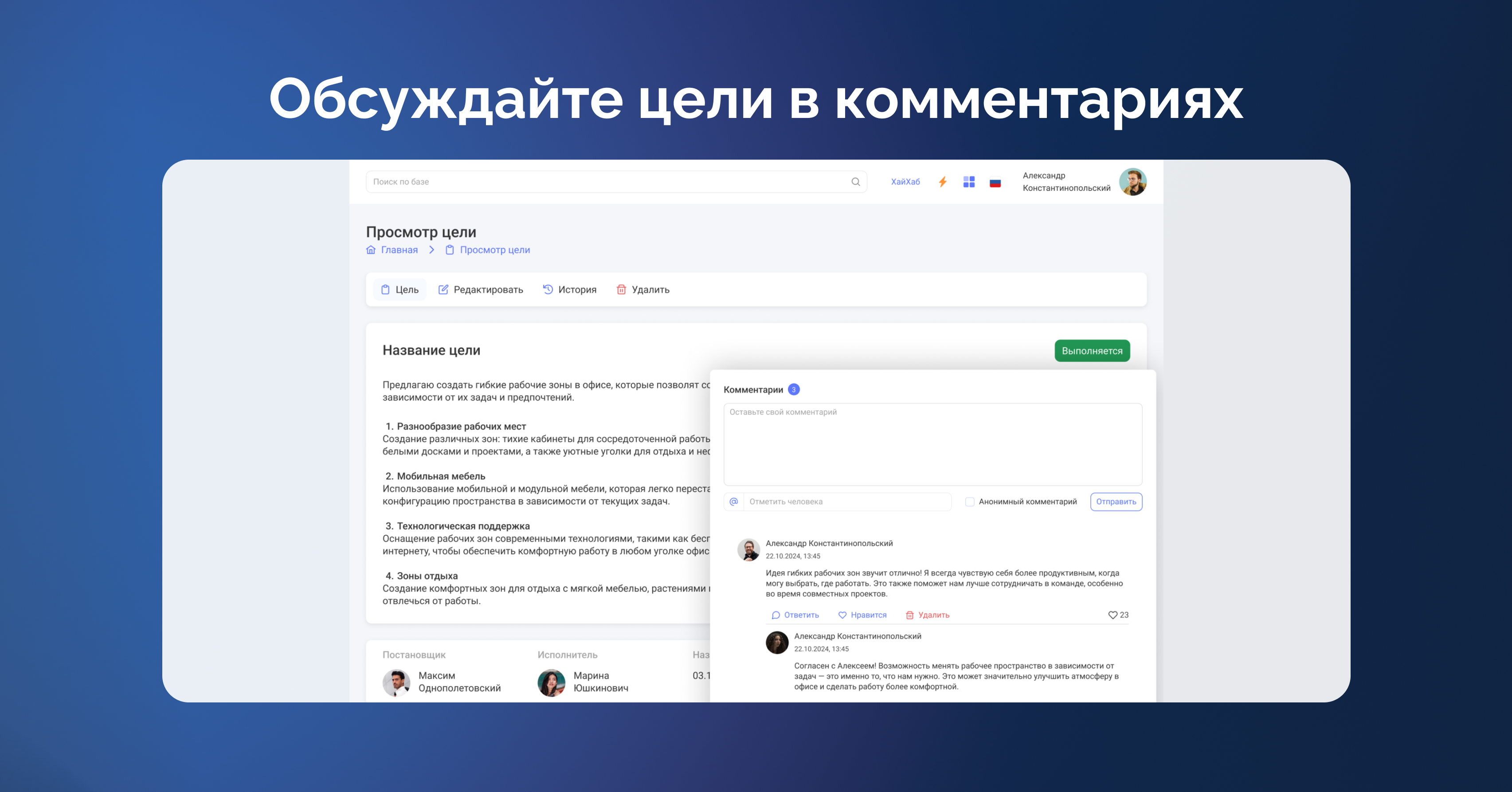 - Обсуждайте прогресс, контролируйте статус или помогайте с выполнением целей в обсуждении внутри карточки цели.