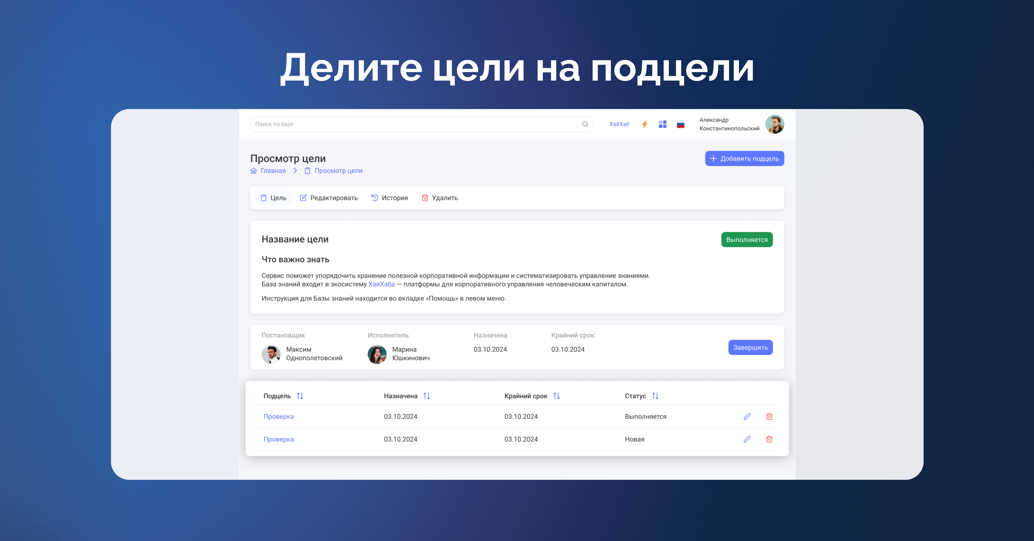 Вы можете делить цели на подцели для формирования четких этапов крупных целей и контроля промежуточных результатов.