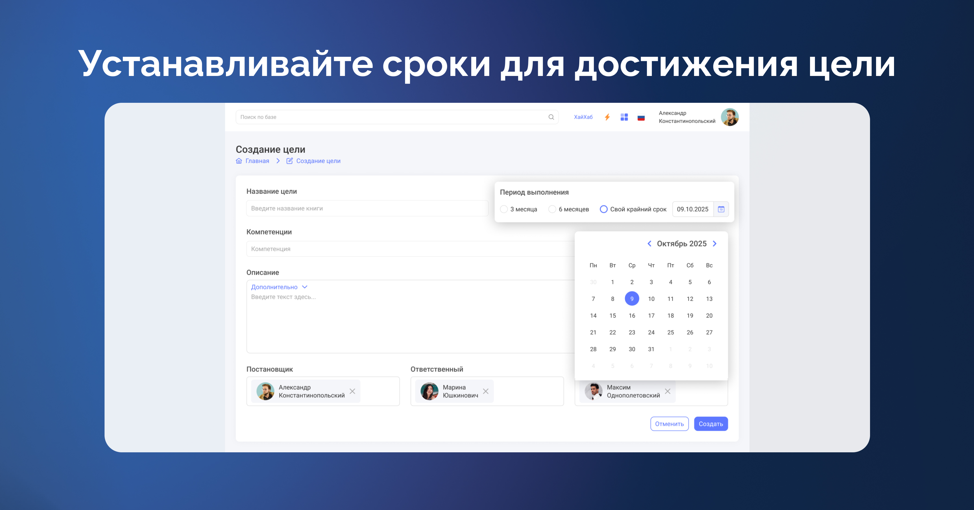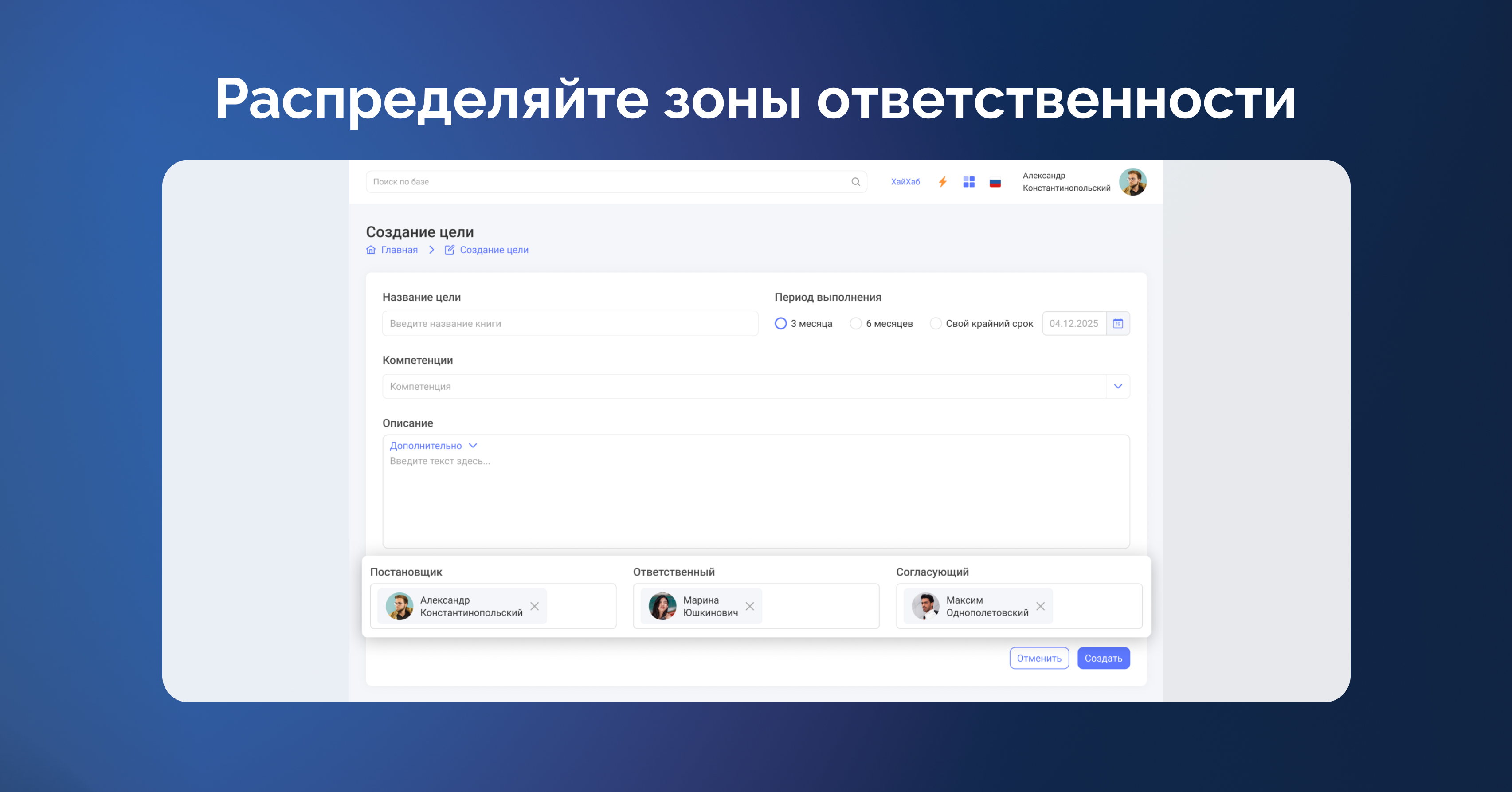 Примерно через 2 минуты вы можете создать цель для сотрудника: укажите название, выберите ответственного и согласующего. Описание цели, срок и компетенции необязательны для заполнения.