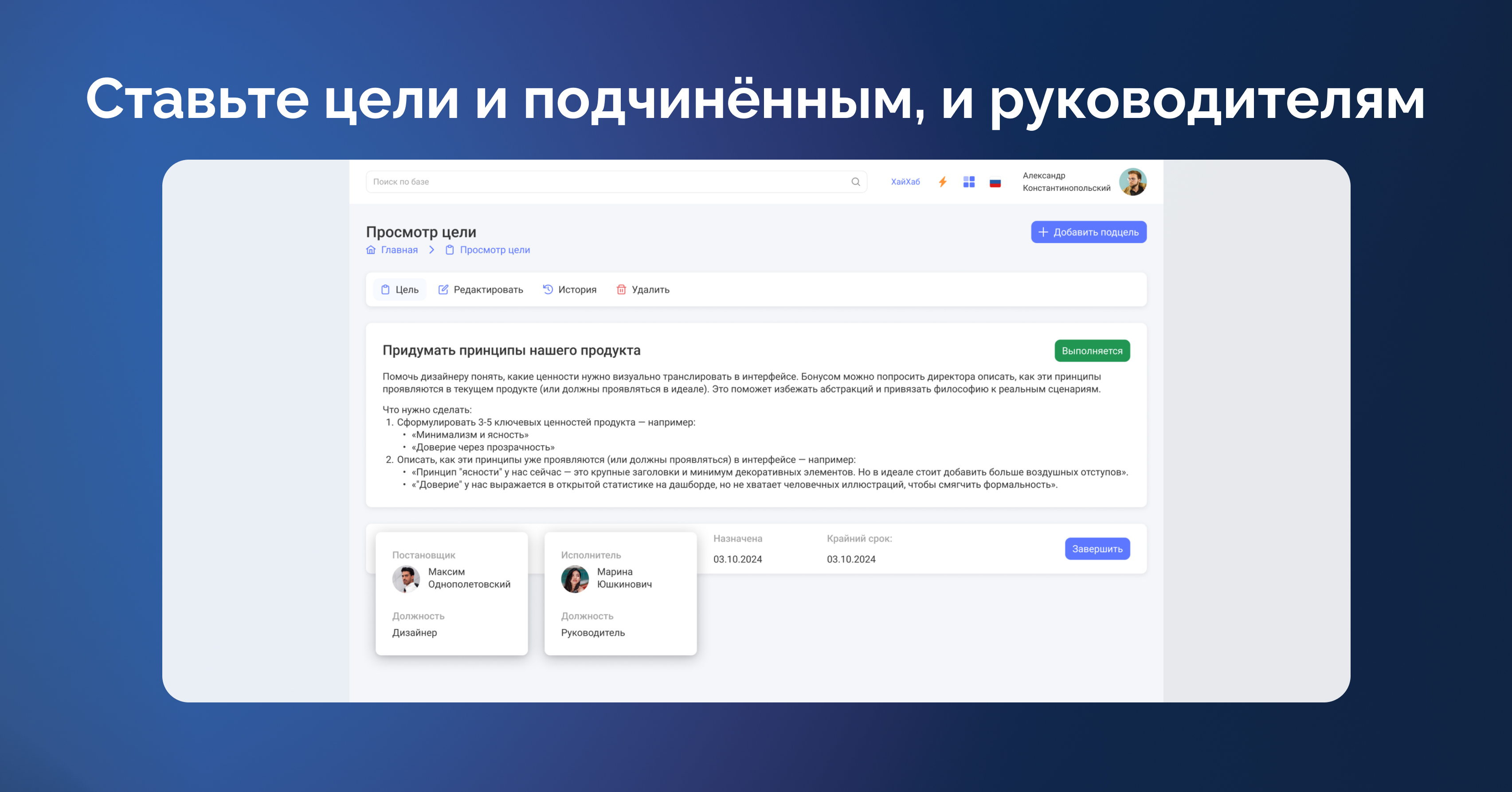 В сервисе гибкая иерархия. Цели могут ставить все и всем: руководитель подчиненным и подчиненные руководителю.