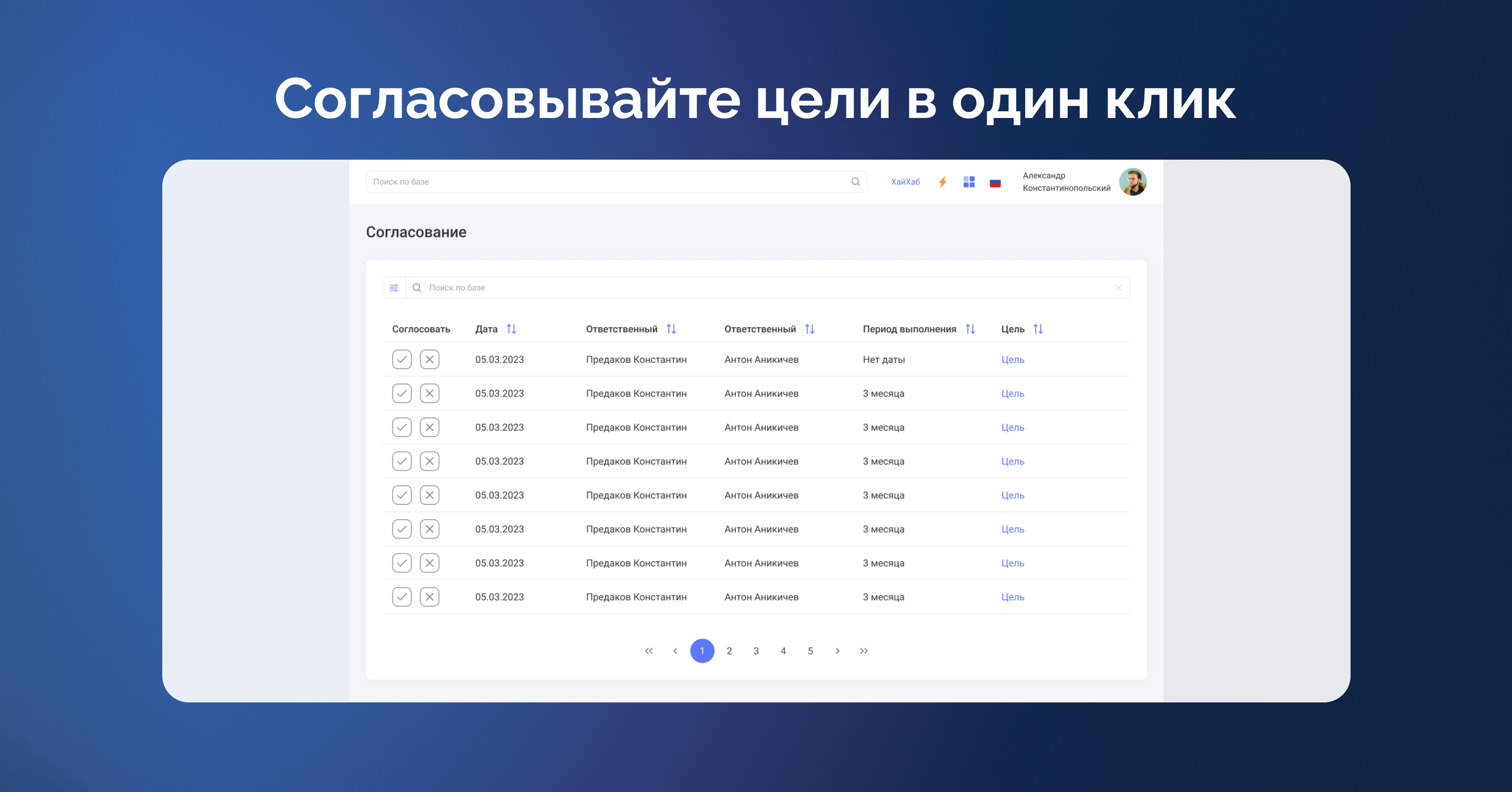 Цели, нуждающиеся в согласовании, попадают в соответствующую вкладку. Их можно согласовать в один клик.