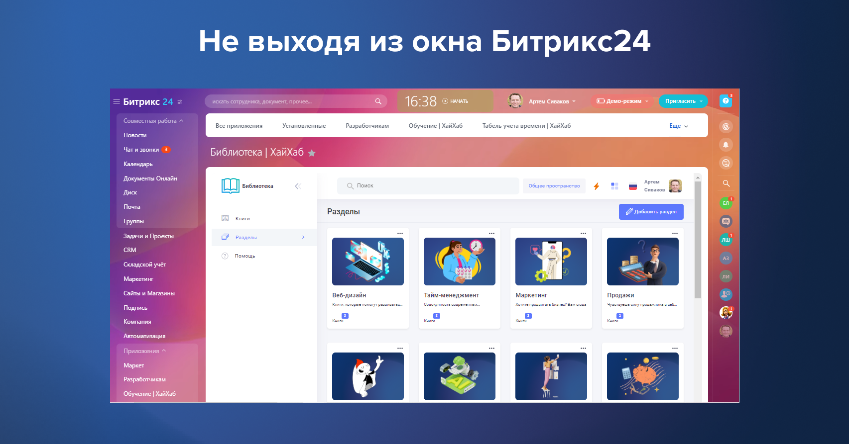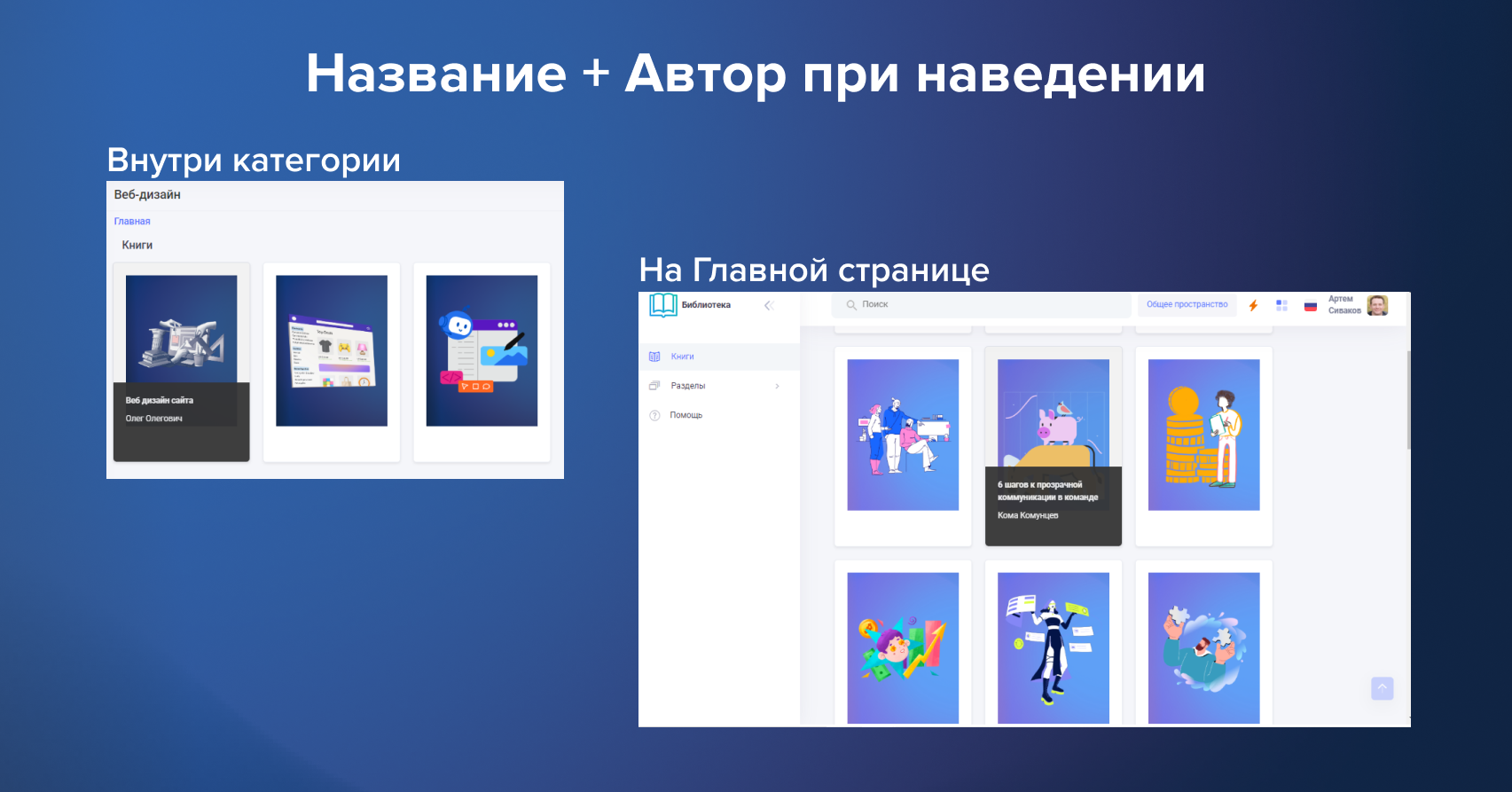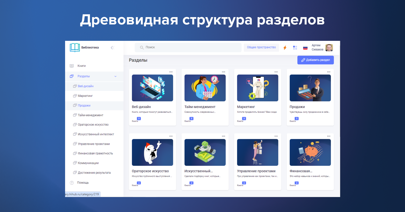 - Разделы в библиотеке. Можно создать древовидную структуру категорий для своей компании: художественная литература, дизайн, маркетинг, тайм-менеджмент, ораторское искусство и другие