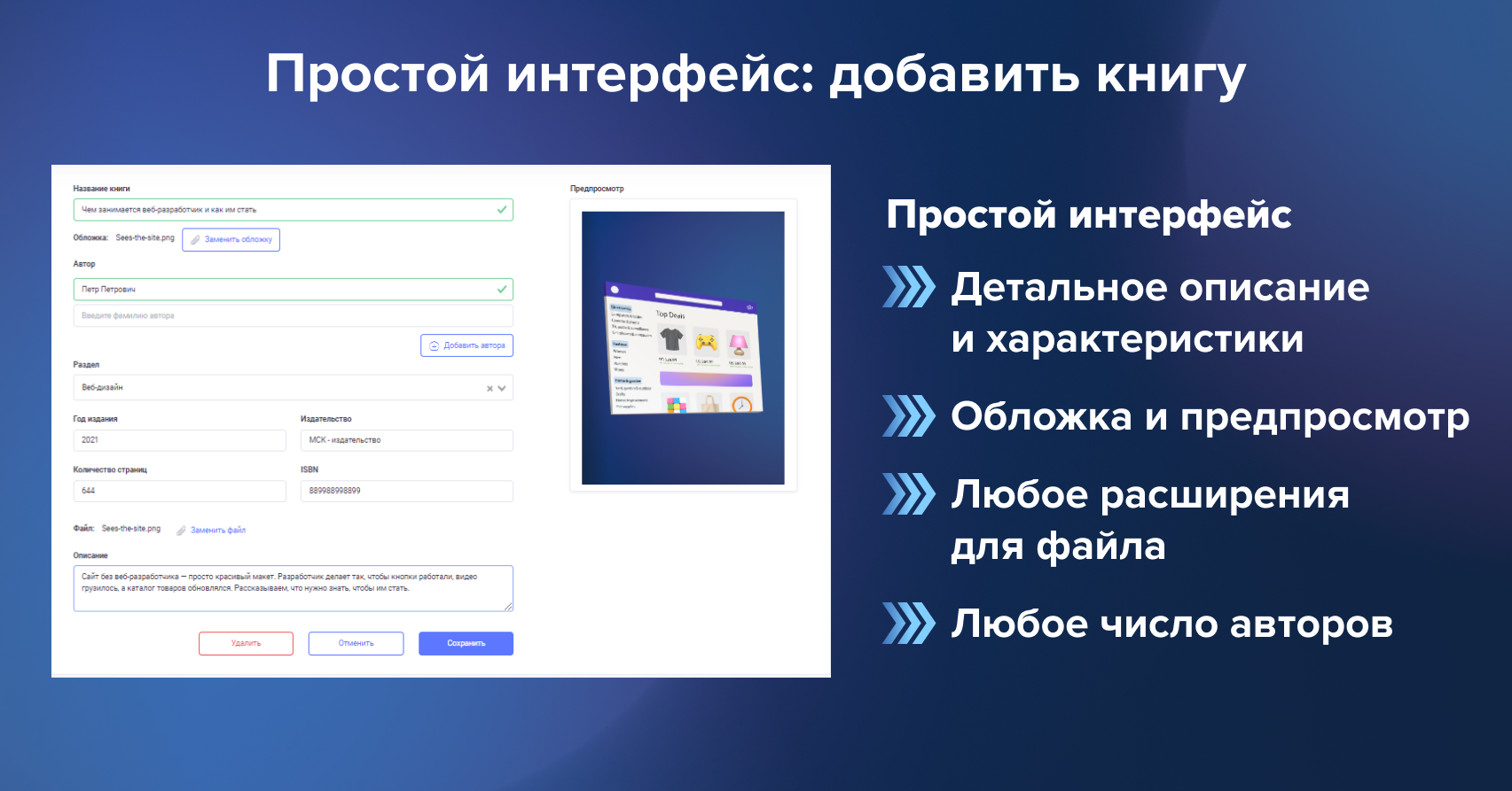- Добавьте новые книги: внесите название, автора, описание, прикрепите обложку и документ. Для удобства можно создать разделы