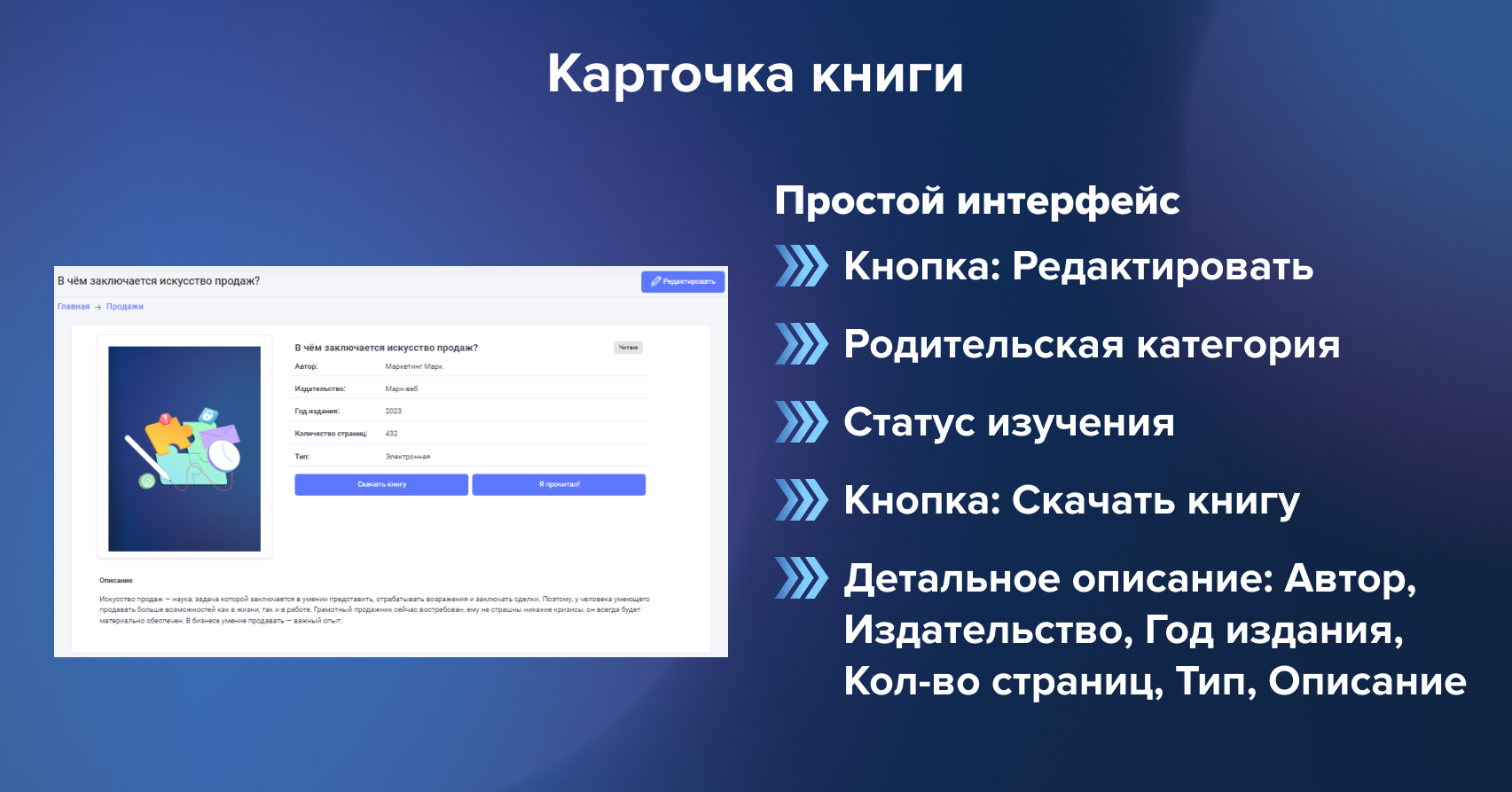 ✅ Пользователь — имеет доступ к разделам и книгам. Может скачивать книги и просматривать статусы прочтения. После прочтения книги можно установить статус «Я прочитал(а)».