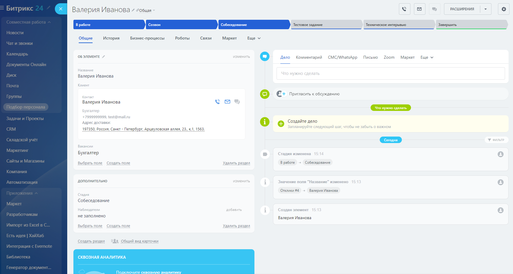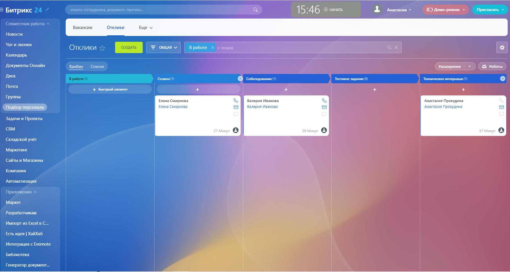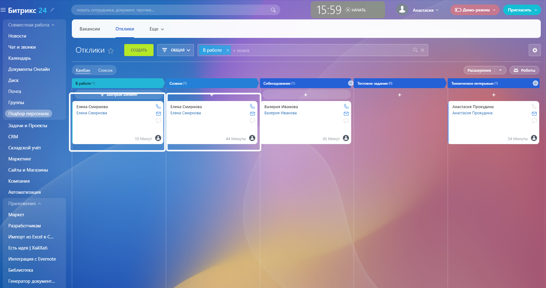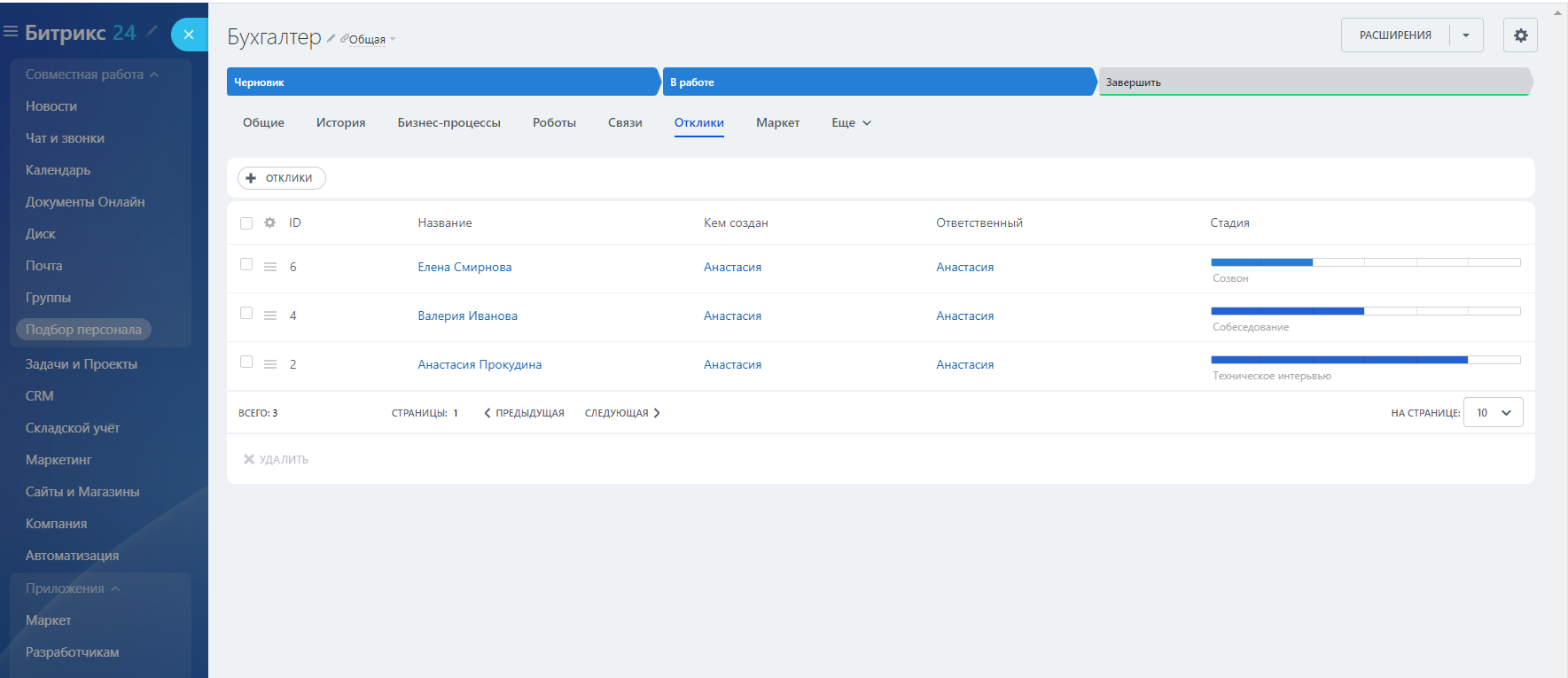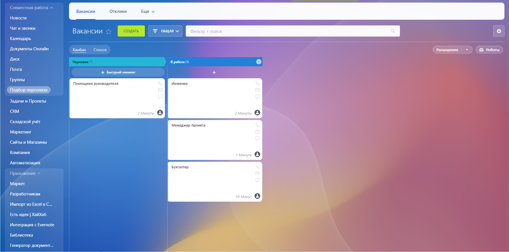 Вы хотите найти лучших кандидатов быстрее и с меньшими усилиями? Наше приложение - это лучшее решение! Оно позволяет Вам создавать и отслеживать вакансии, работать с откликами, менять их стадии и вести коммуникацию в рамках конкретной вакансии или отклика. Весь процесс реализуется на базе Битрикс 24.