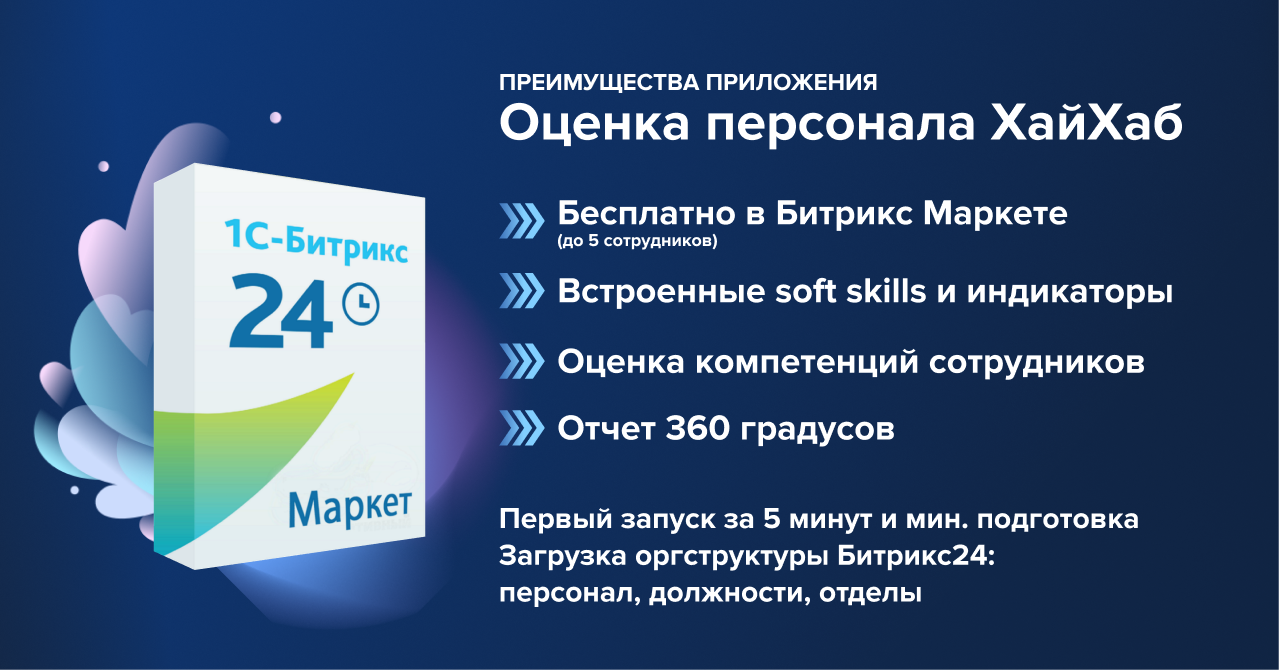 Приложение «Оценка персонала» позволяет оценивать компетенции сотрудников и уровень владениями ими. Сразу после установки вы сможете запустить оценку soft skills — в систему встроен набор из 7 компетенций с индикаторами. Число запусков неограниченно.