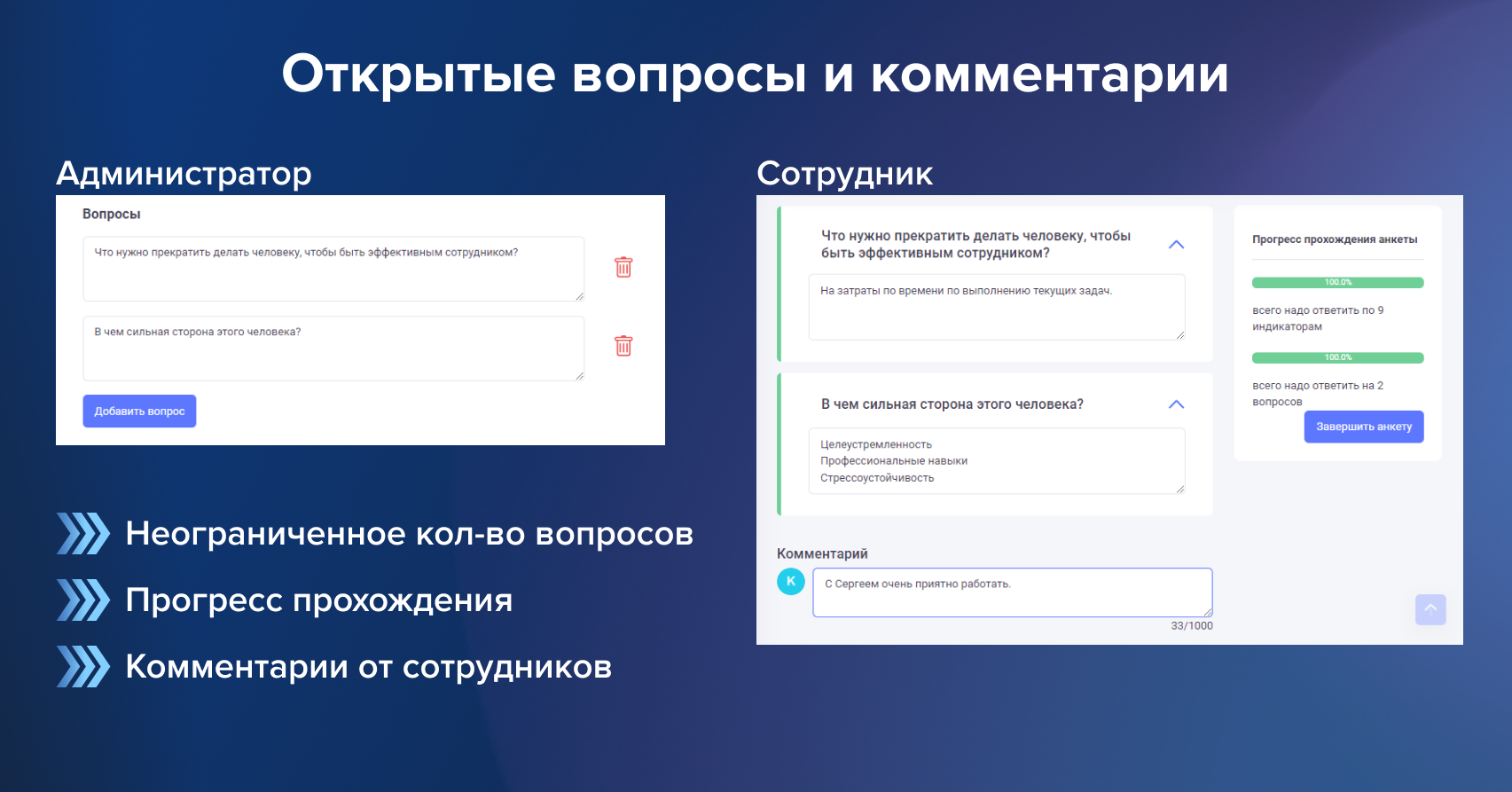 - По желанию — Администратор может добавить неограниченное количество компетенций и индикаторов (soft или hard skills), добавить открытые вопросы, управлять анонимностью и шкалой оценки