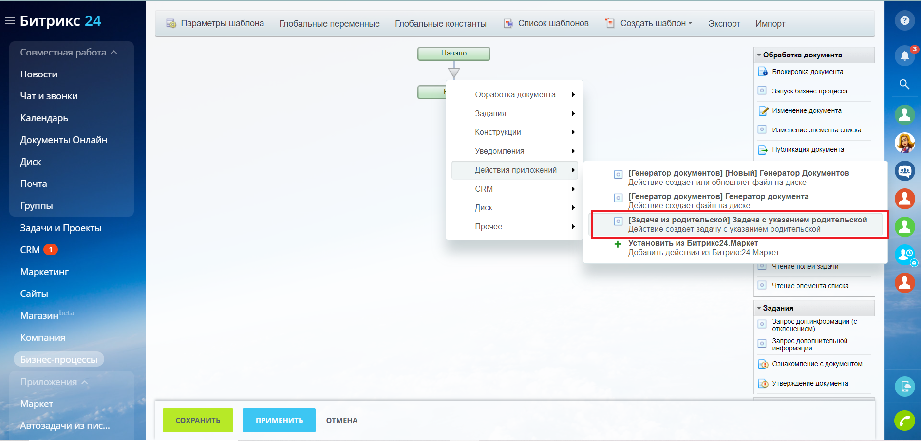 3. Выберите «Действие приложений», затем из предложенного списка – «Задача с указанием родительской».