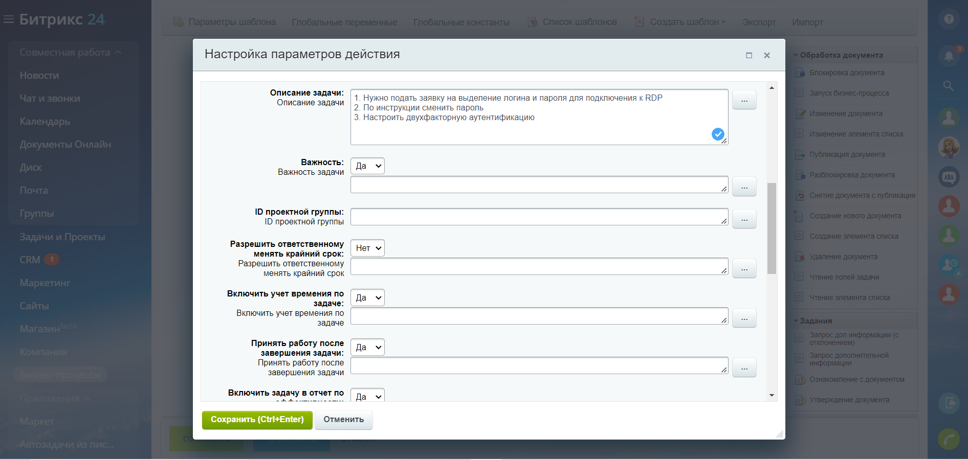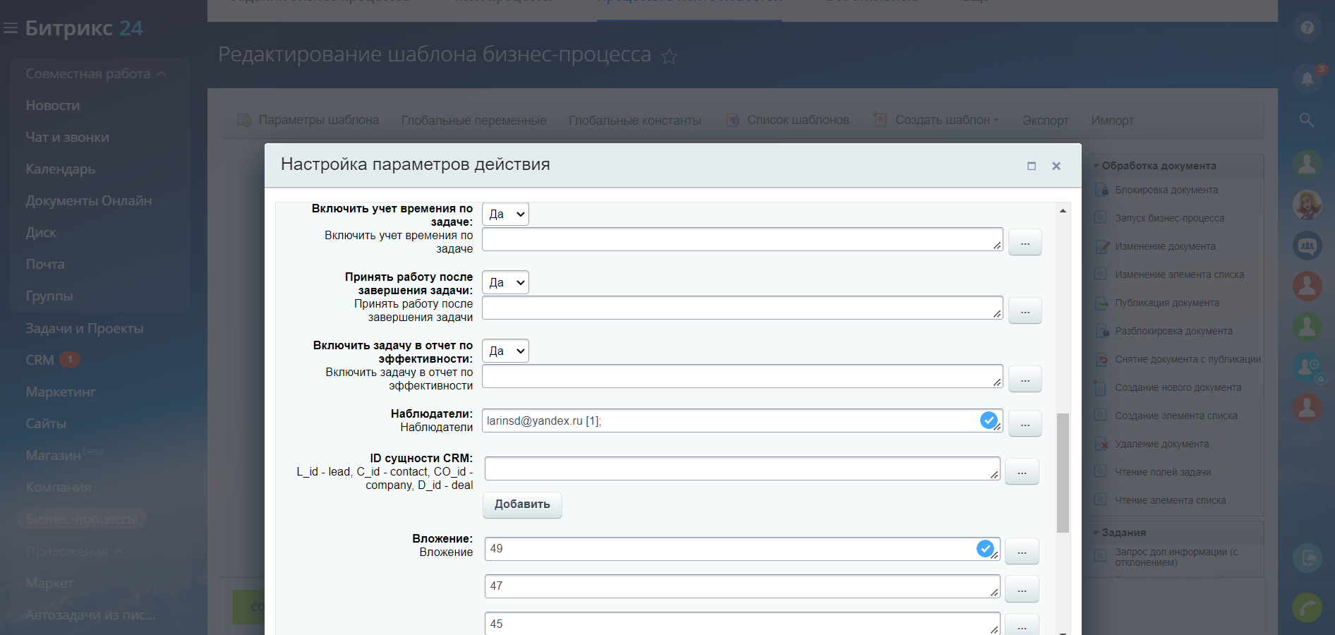 2. Нажмите на кнопку «Действия», где вы сможете настроить «Бизнес –процесс» и «Создать».