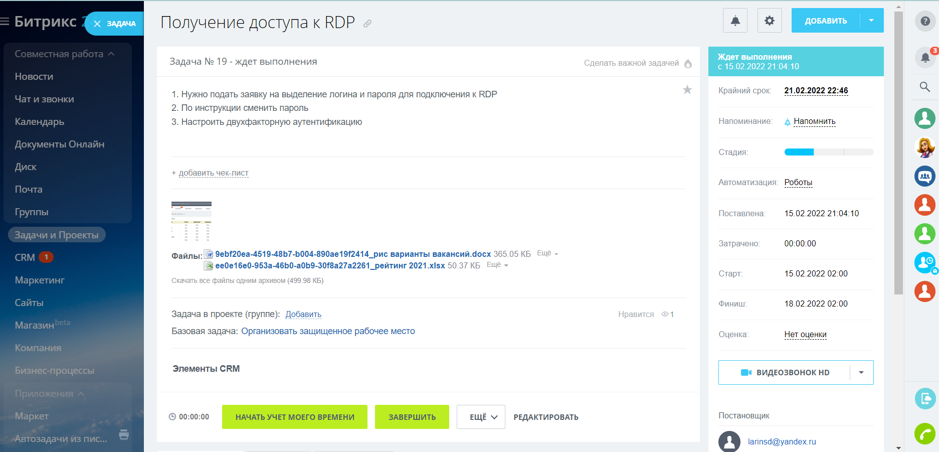 Также есть возможность привязывать задачу к сущностям CRM и прикреплять к задаче файлы, находящиеся на диске.