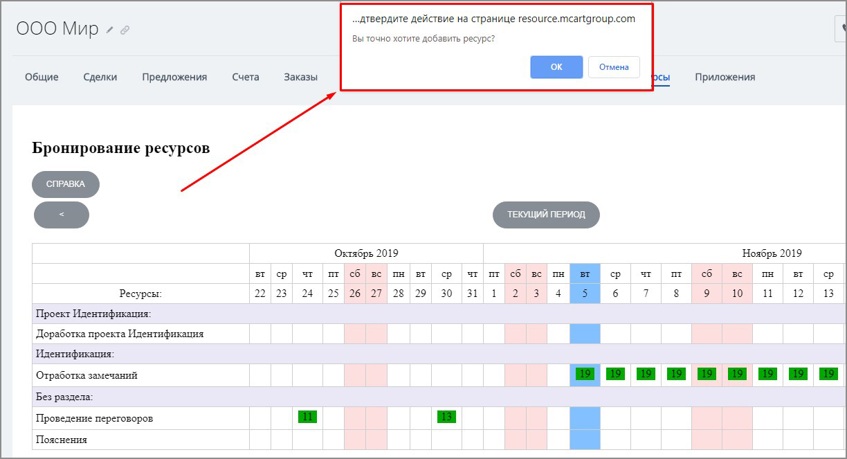 Таблица ресурсов будет отображаться на вкладках сущностей CRM.