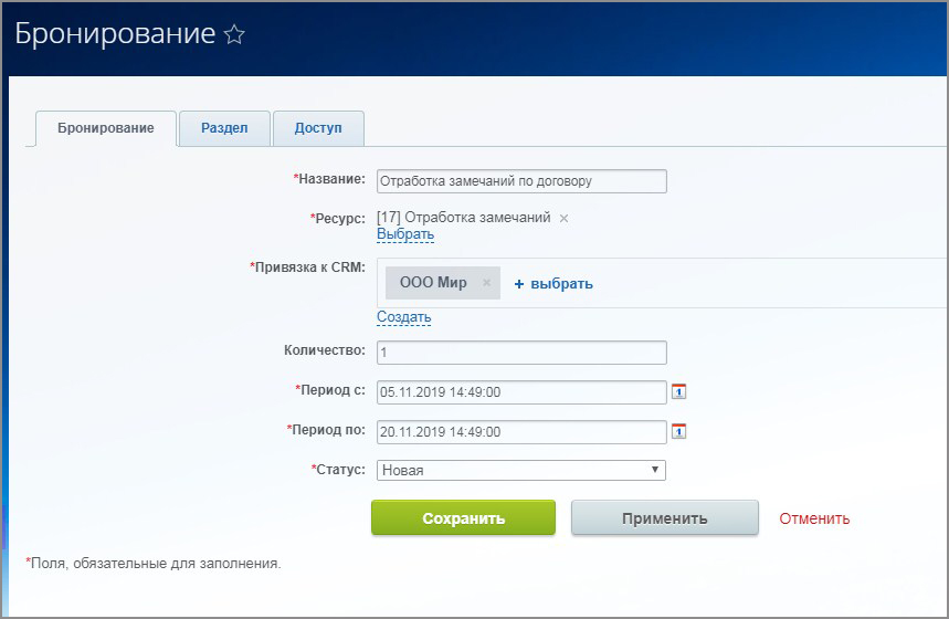 В списке «Бронирования» можно просмотреть список созданных заявок и отредактировать их, либо создать новые вручную. Каждый элемент будет привязан к той сущности CRM, из карточки которого был назначен ресурс.