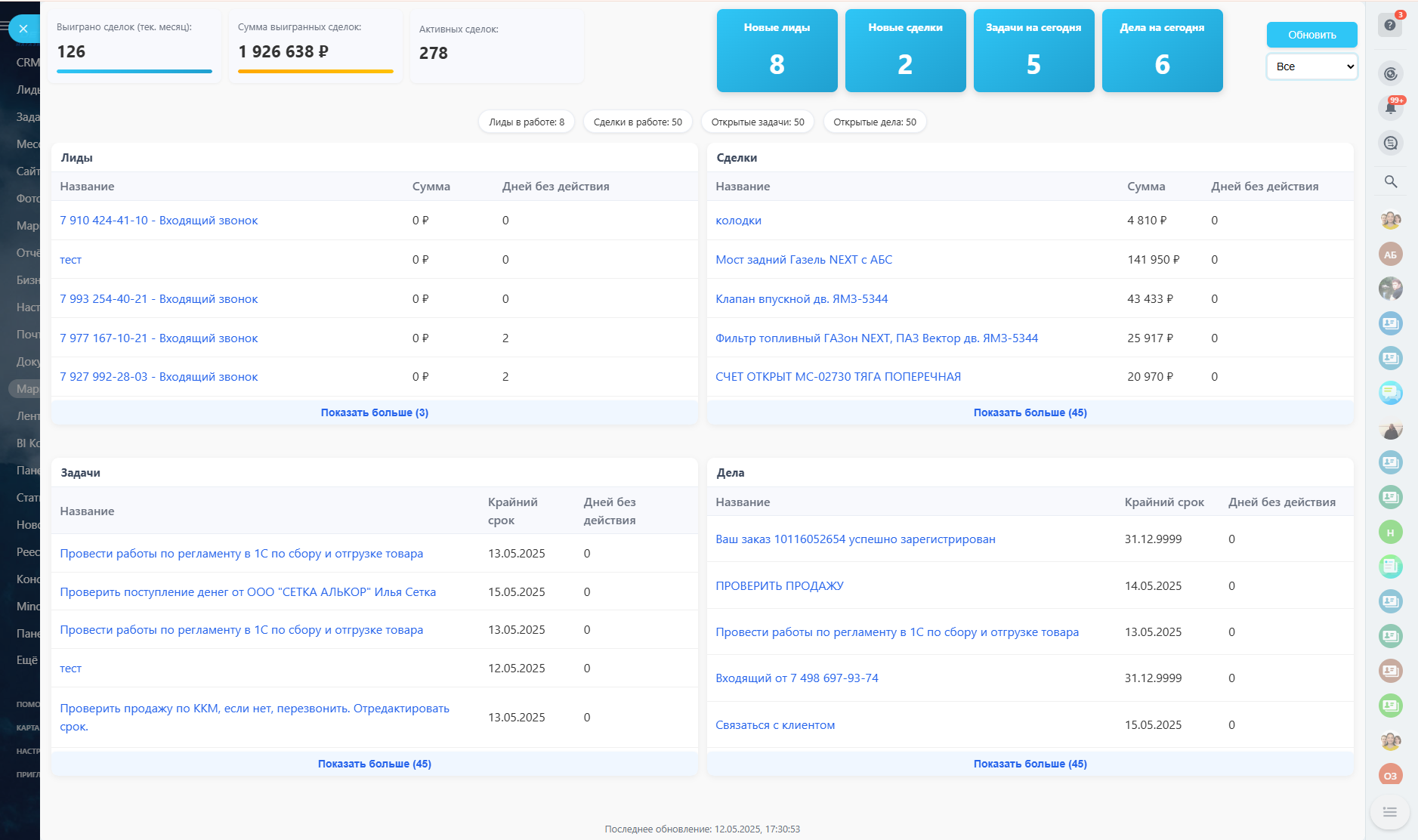 - Гибкая фильтрация: Данные на панели могут быть отфильтрованы для просмотра информации по конкретному ответственному сотруднику («Мои» дела/задачи/сделки) или по всем сотрудникам («Все»).