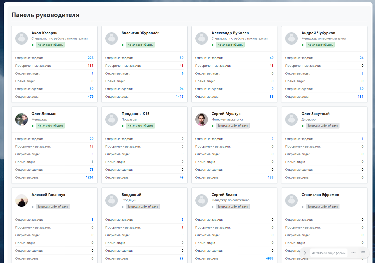 CRM (crm): Для подсчета лидов, сделок и дел сотрудников.