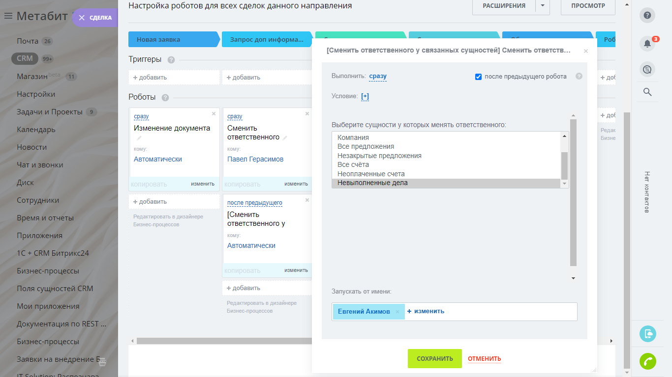 - Настройте робота. Обязательно поставьте галочку «после предыдущего робота» и выберите сущности, у которых менять ответственного.