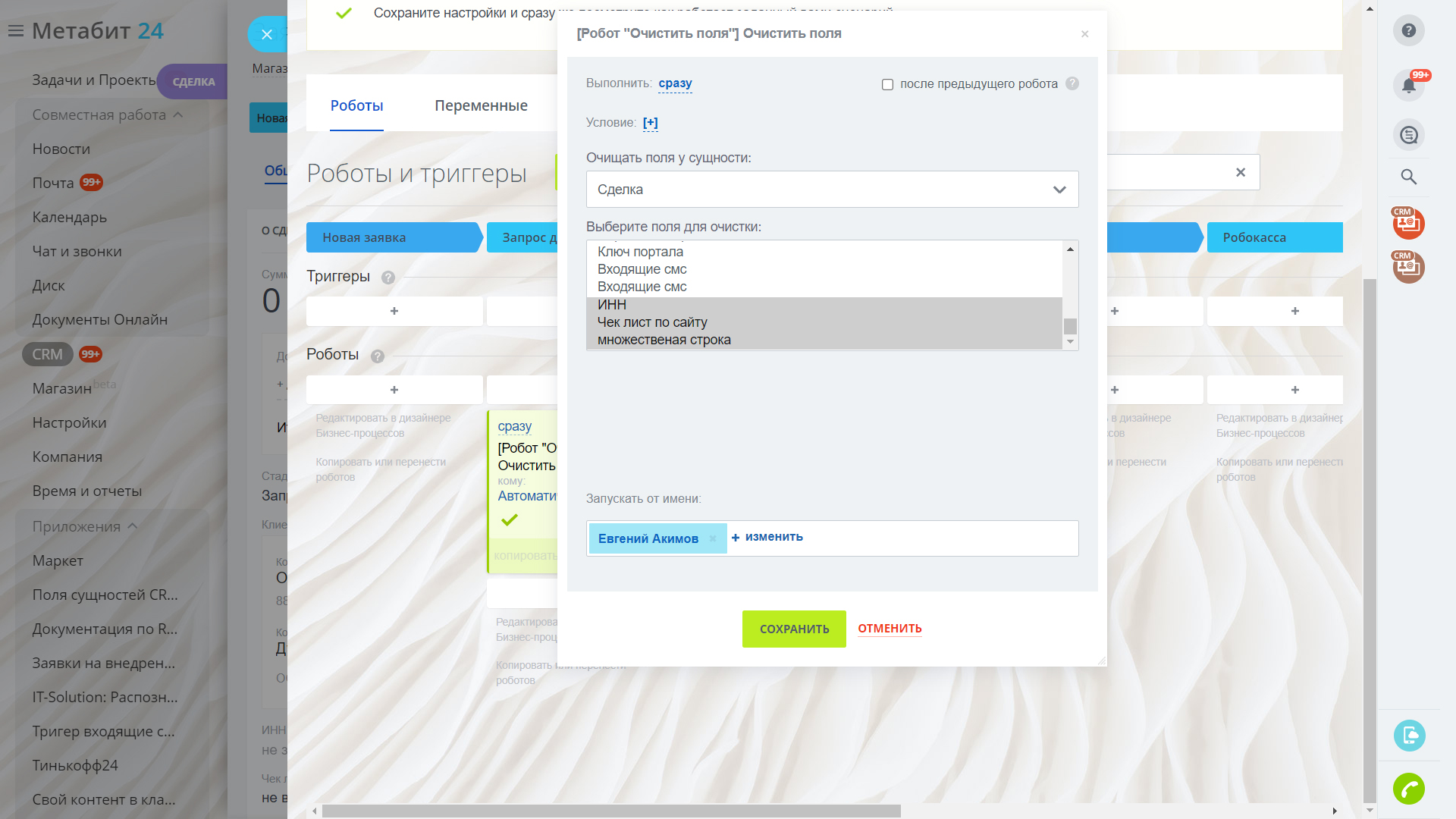 2. Добавьте робота «Очистить поля» на одну из стадий лида/сделки
