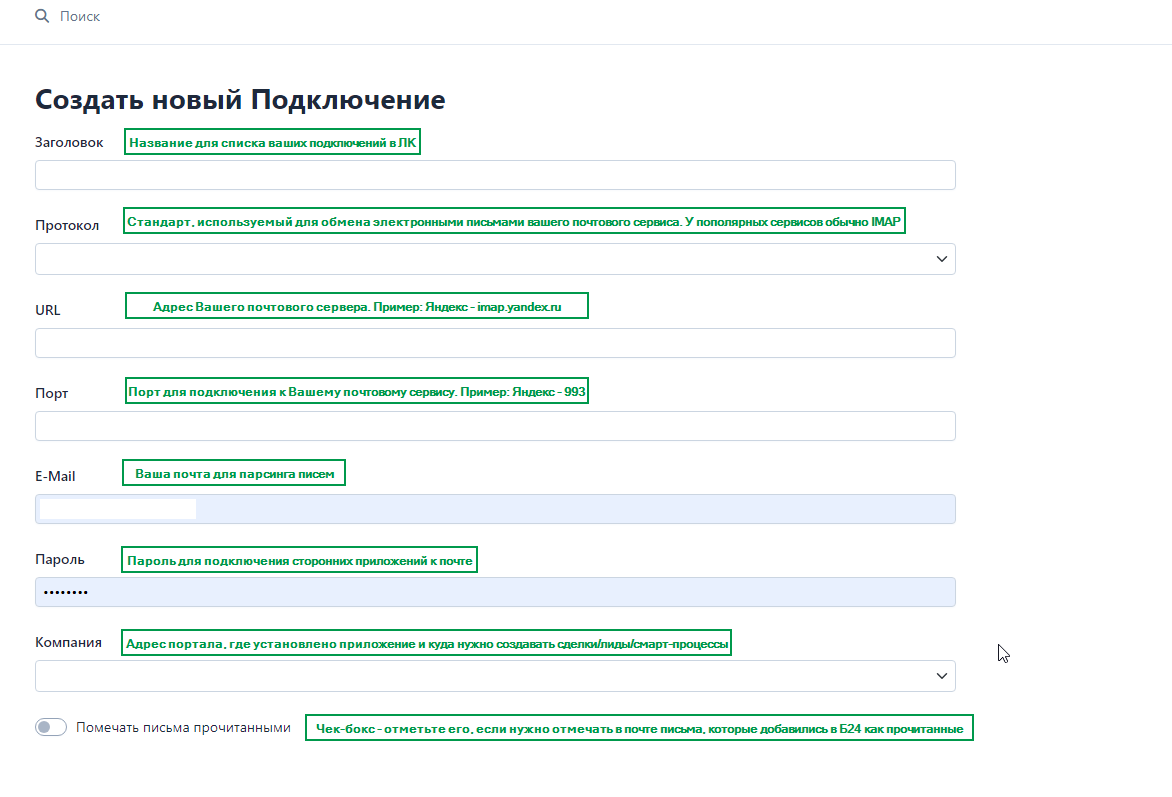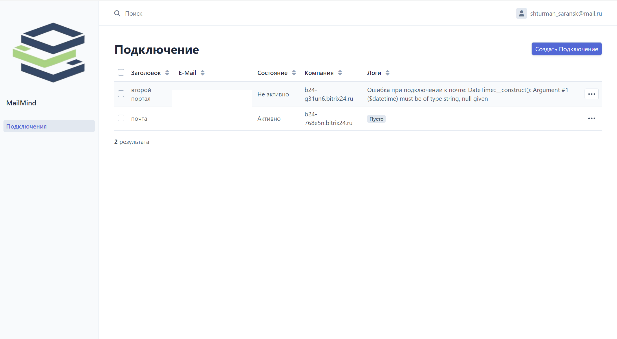 3. В lk.mailmind.ru необходимо создать подключение почты для парсинга