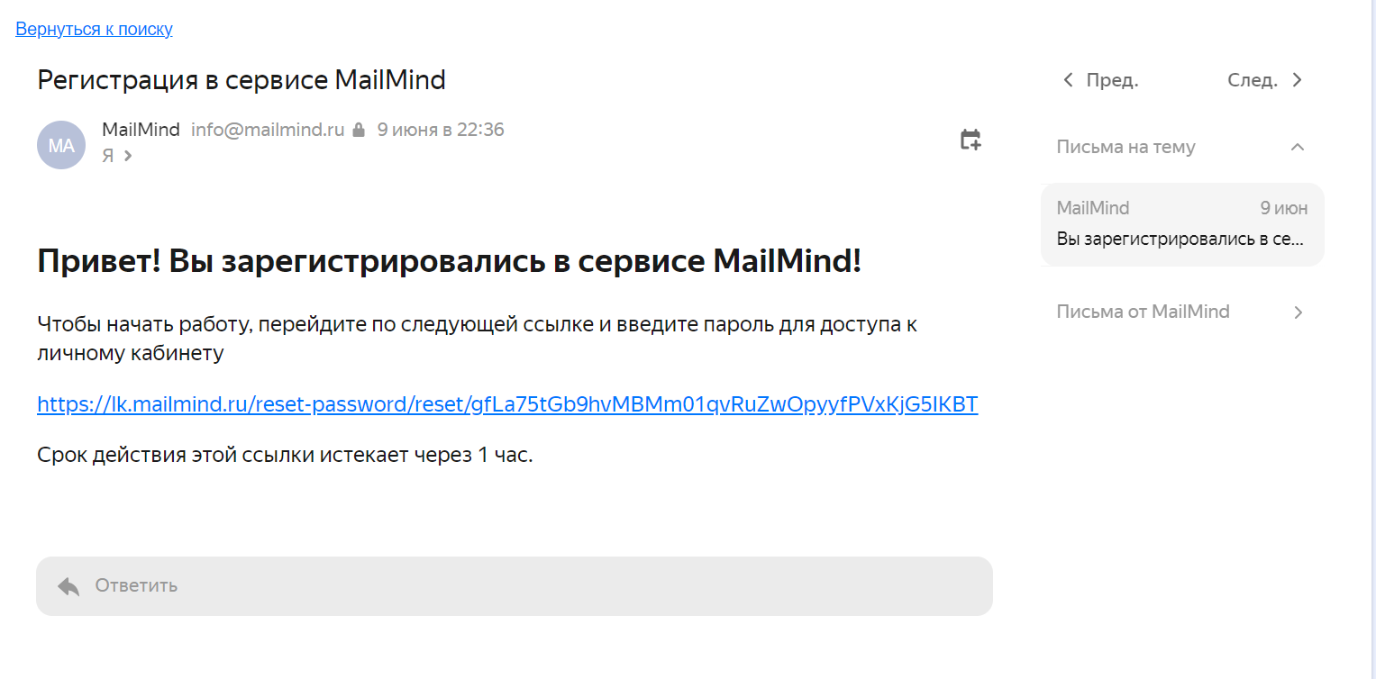 2. На почту портала придет письмо для регистрации в ЛК MailMind - необходимо зарегистрироваться