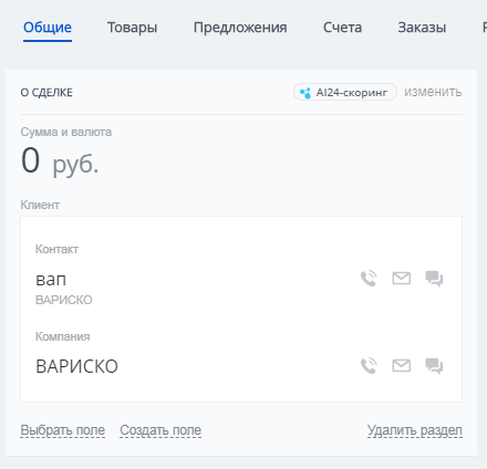 1) Бухгалтерия. Когда приходит заказ на услуги бухгалтера, то переносите сделку именно сюда. Если клиент регулярный, создавайте регулярные сделки или регулярные счета, отправляемые автоматически. Здесь есть удобная карточка сделки: вы сможете указать основные данные вашего клиента, тип фирмы, систему налогообложения, количество сотрудников. Кстати, если бюджет больше 50 000 руб., то руководитель получит извещение об этом.