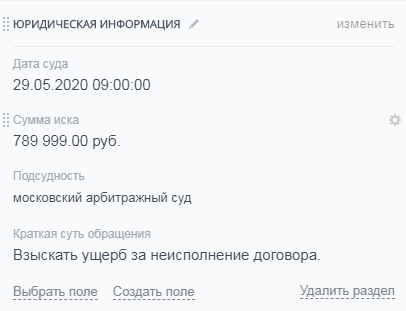 3) Юридические услуги. Это частая дополнительная услуга в компаниях бух. обслуживания. Мы вывели ее в отдельную воронку для удобства. Карточка сделки адаптирована под потребности юристов: здесь можно указать дату суда, подсудность, сумму исковых требований. CRM "Бухгалтерский аутсорсинг" поставит менеджеру задание, уведомит его об оплате счета и сама переведет сделку в стадию подготовки документов к суду. А после отправит клиенту письмо с просьбой оставить отзыв.