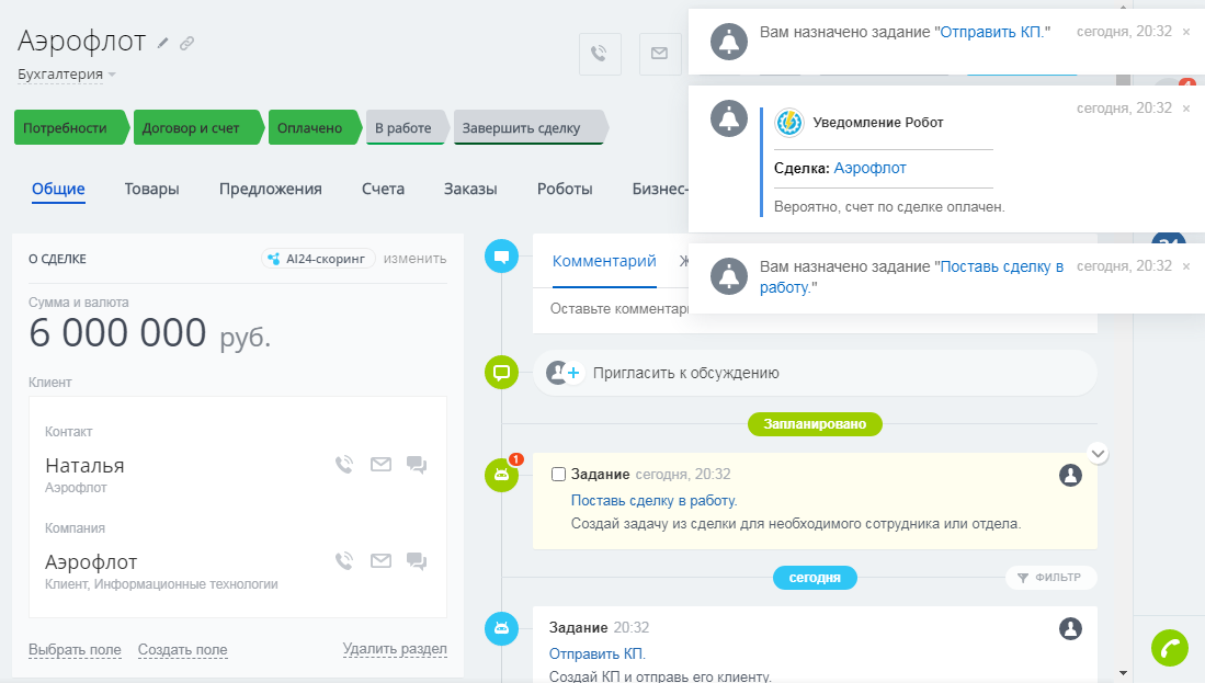 Установлен триггер оплаты счета: когда клиент оплатит счет, то сделка автоматически перейдет в следующую стадию. Если оплату счета отметит бухгалтер или кто-то еще, менеджеру упадет уведомление об оплате и переходе сделки далее.