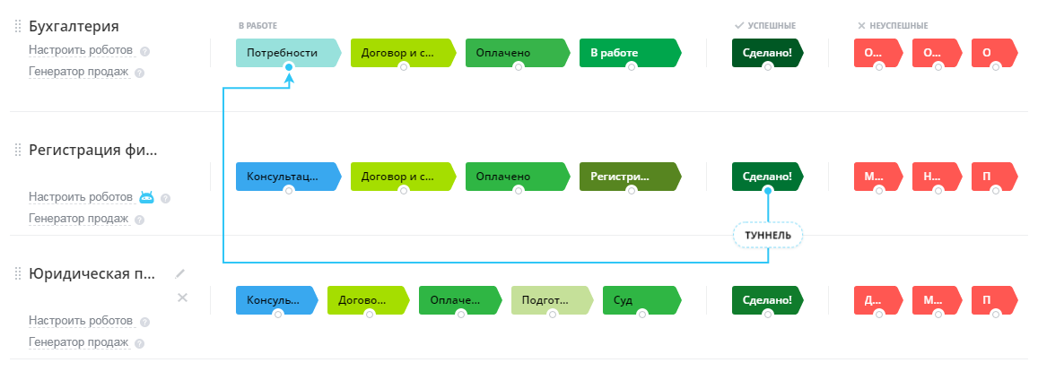 2) Регистрация фирм. К вам обратились за регистрацией или внесением изменений - ведите сделку по этой воронке. Стадии коротки, удобны, а по завершении клиент получит письмо "Работы по регистрации выполнены". Кроме того, по окончании этой воронки, сделка автоматически продублируется по тоннелю в раздел "Бухгалтерия", чтобы вы предложили клиенту дополнительные услуги.