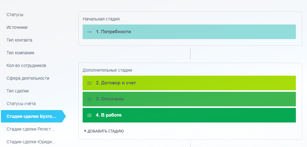 В CRM "Бухгалтерский аутсорсинг" реализовано три направления сделок: