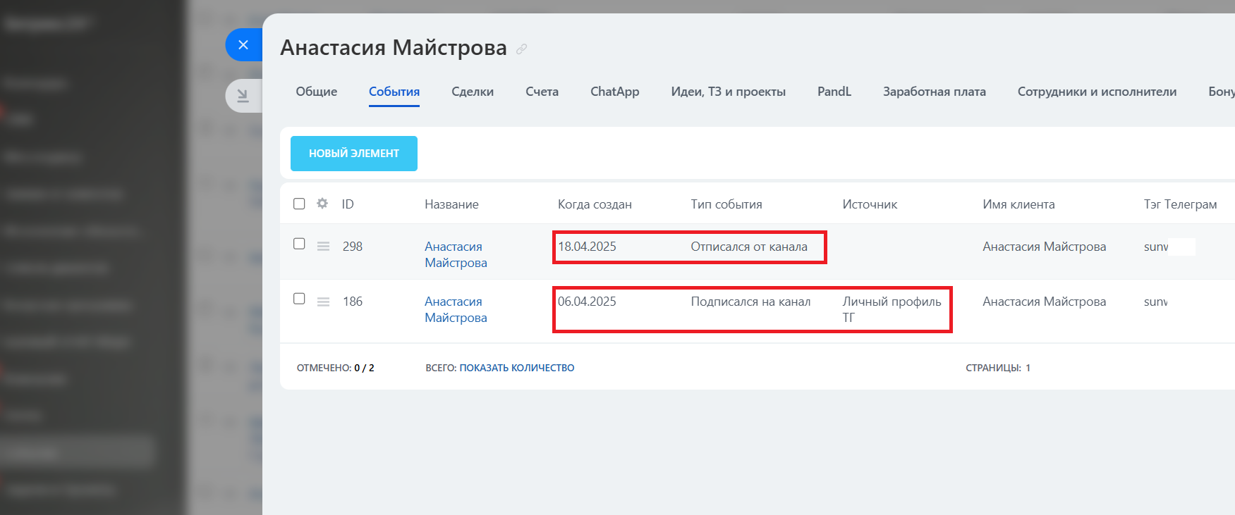 Приложение позволяет отслеживать новых подписчиков, с учётом источника трафика. В момент подписки на канал создаётся Контакт, если он отсутствовал ранее и добавляет запись в меню "События". Это же касается событий "Отписался от канала" и "Новое сообщение".