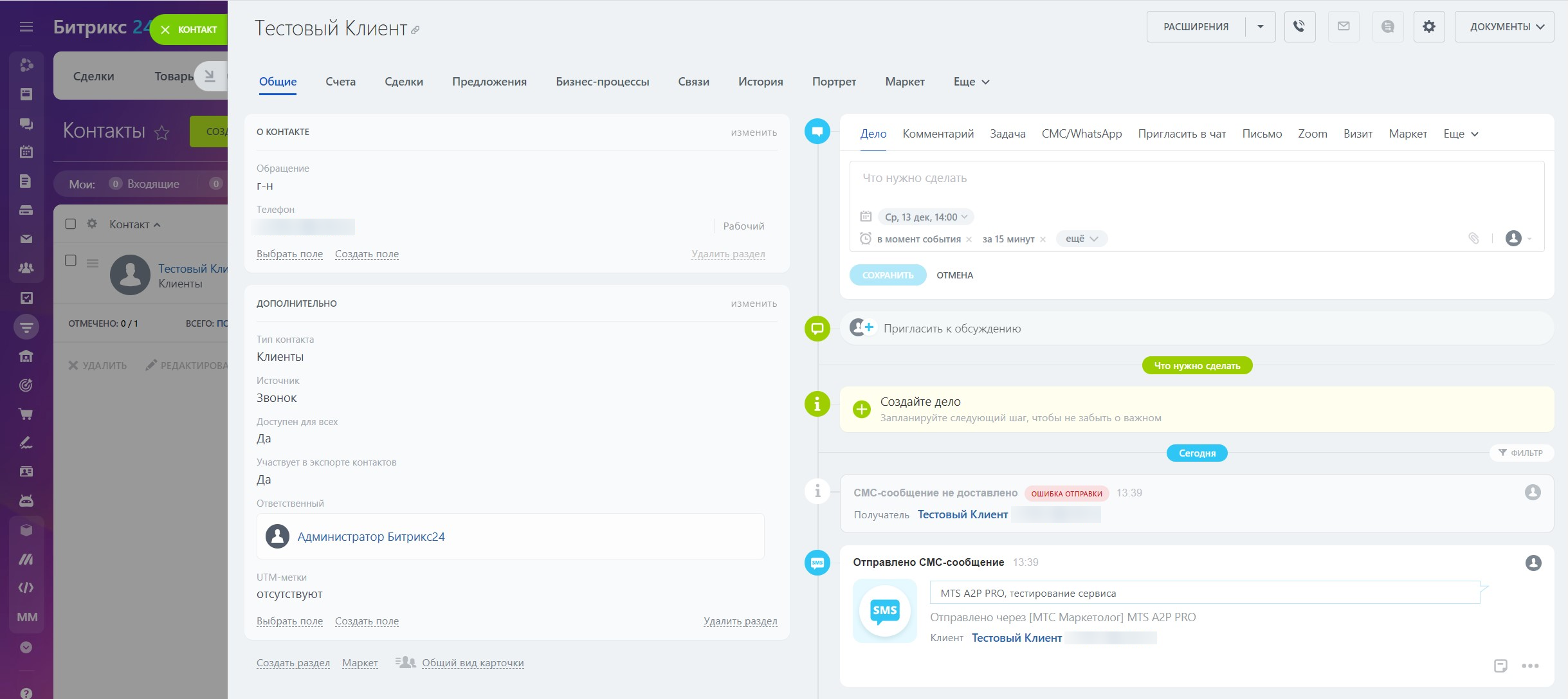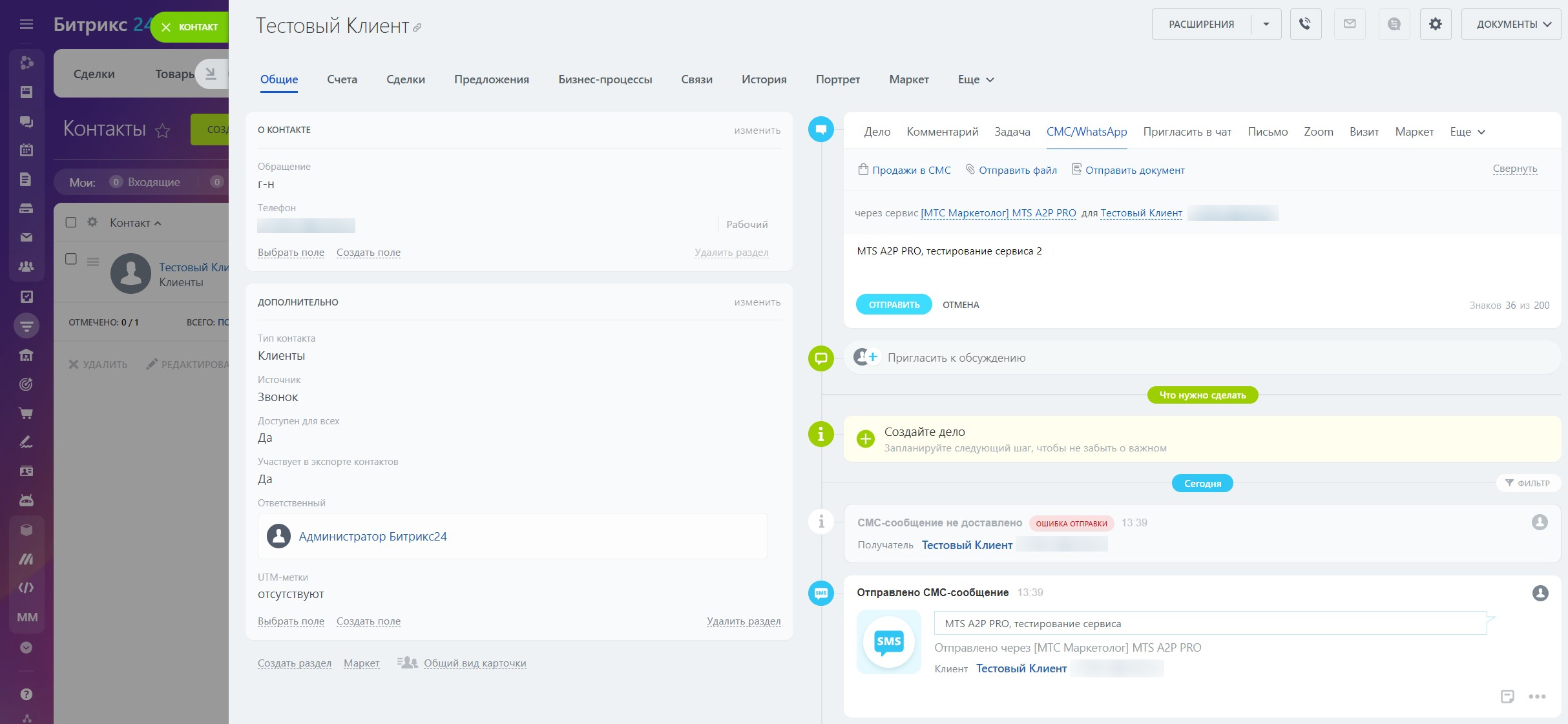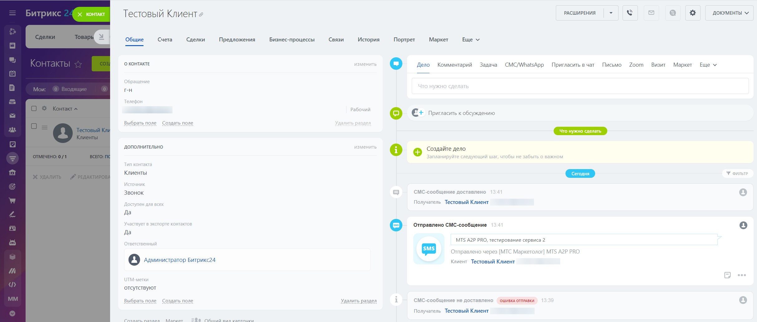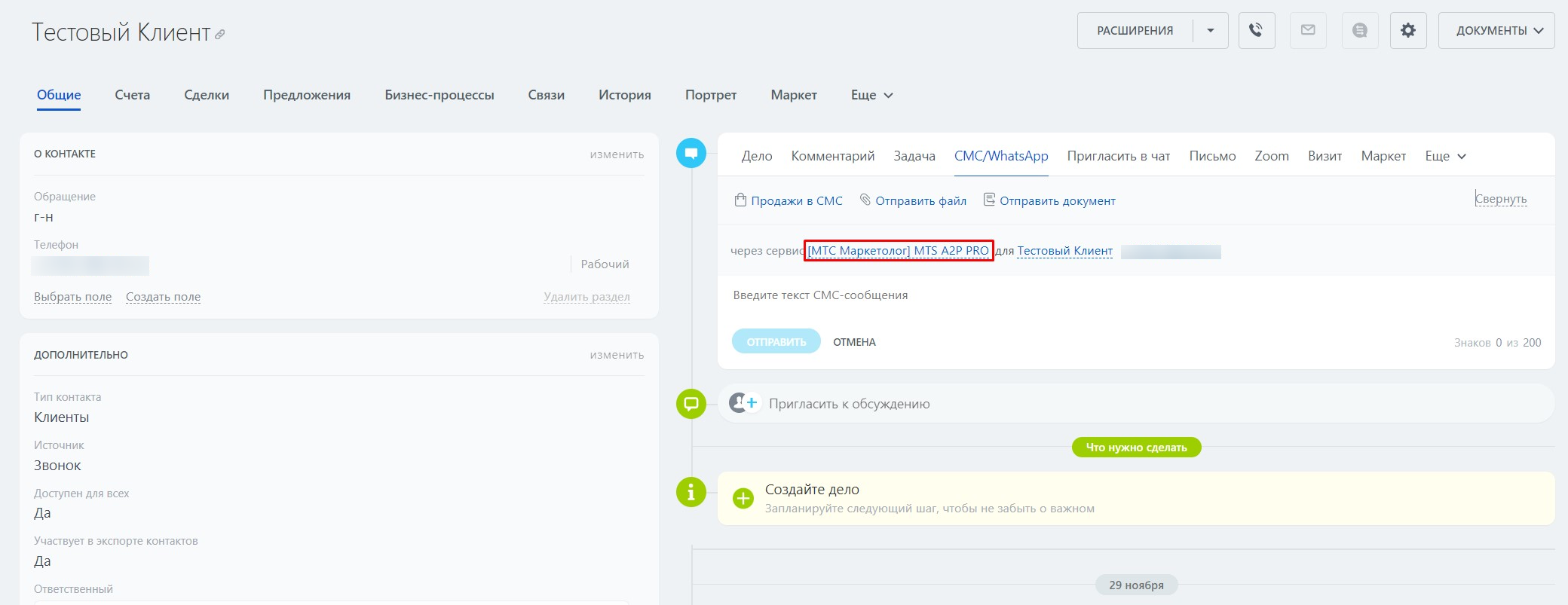 Приложение позволяет отправлять SMS на номера любых операторов из карточки клиента. Для этого нужно быть клиентом МТС Маркетолога, создать имя отправителя и подключить пакет SMS.