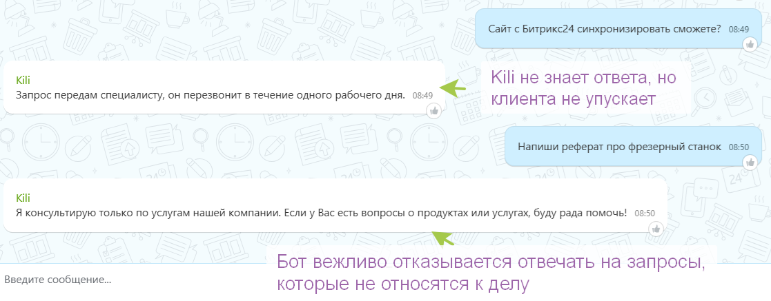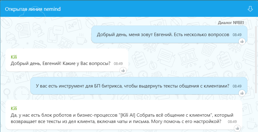 Забудьте о примитивных скриптах. Kili понимает контекст, ваши товары из каталога Битрикс24 и даже умеет рассчитывать стоимость.