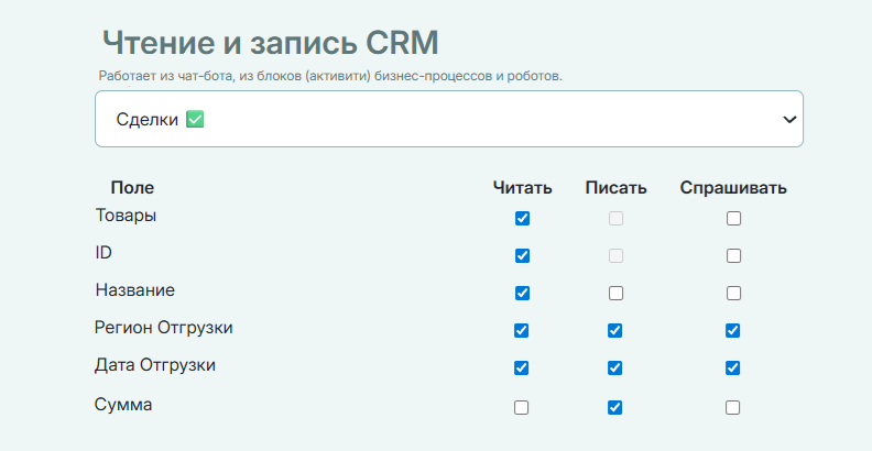 Просто выбирайте мышью в приложении: какие поля CRM нужно записать, и какие читать для ответов конкретному клиенту. Не обязательно писать код или промпты.