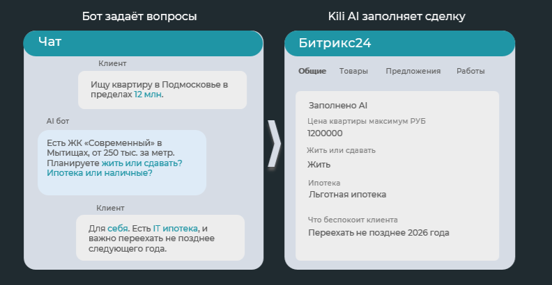 | Пример: Клиент пишет: «Ищу двухкомнатную в новостройке в центре, у меня IT-ипотека, до 15 млн». Kili не только поймёт запрос, но и запишет в сделку: Количество комнат: Двухкомнатная Бюджет: 15 000 000 (тип - число) Тип ипотеки: IT (тип - список). |