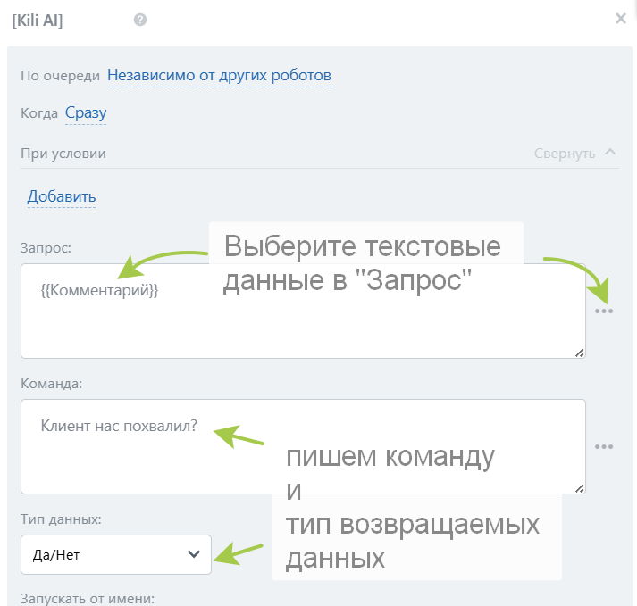 | Важно: При работе в роботах всегда ставьте блоки, обращающиеся к результатам Kili, «После предыдущего», чтобы дождаться ответа от AI. |