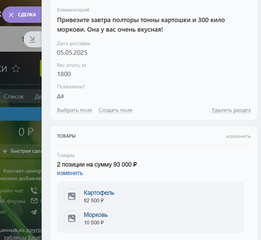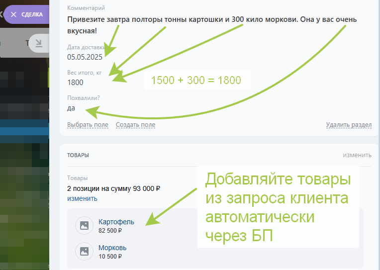 Система автоматически добавляет товары в сделки на основе запроса клиента.