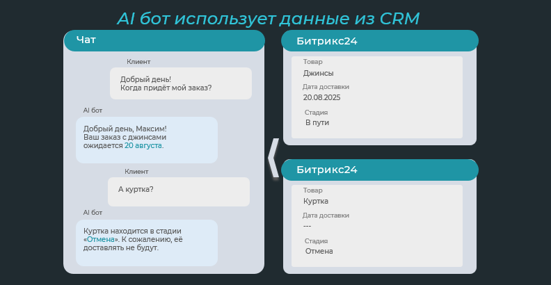 Бот отвечает на вопросы клиента, используя данные из сделок и заказанных товаров