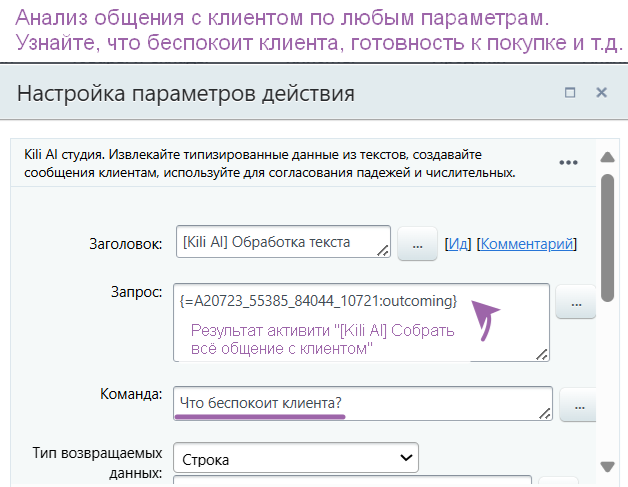 Готовые AI-активити для роботов и БП: Используйте блоки [Kili AI] Обработка текста и [Kili AI] Анализировать и записать в CRM для извлечения структурированных данных (Дата, Число, Список, Текст) и автоматического заполнения любых полей CRM.