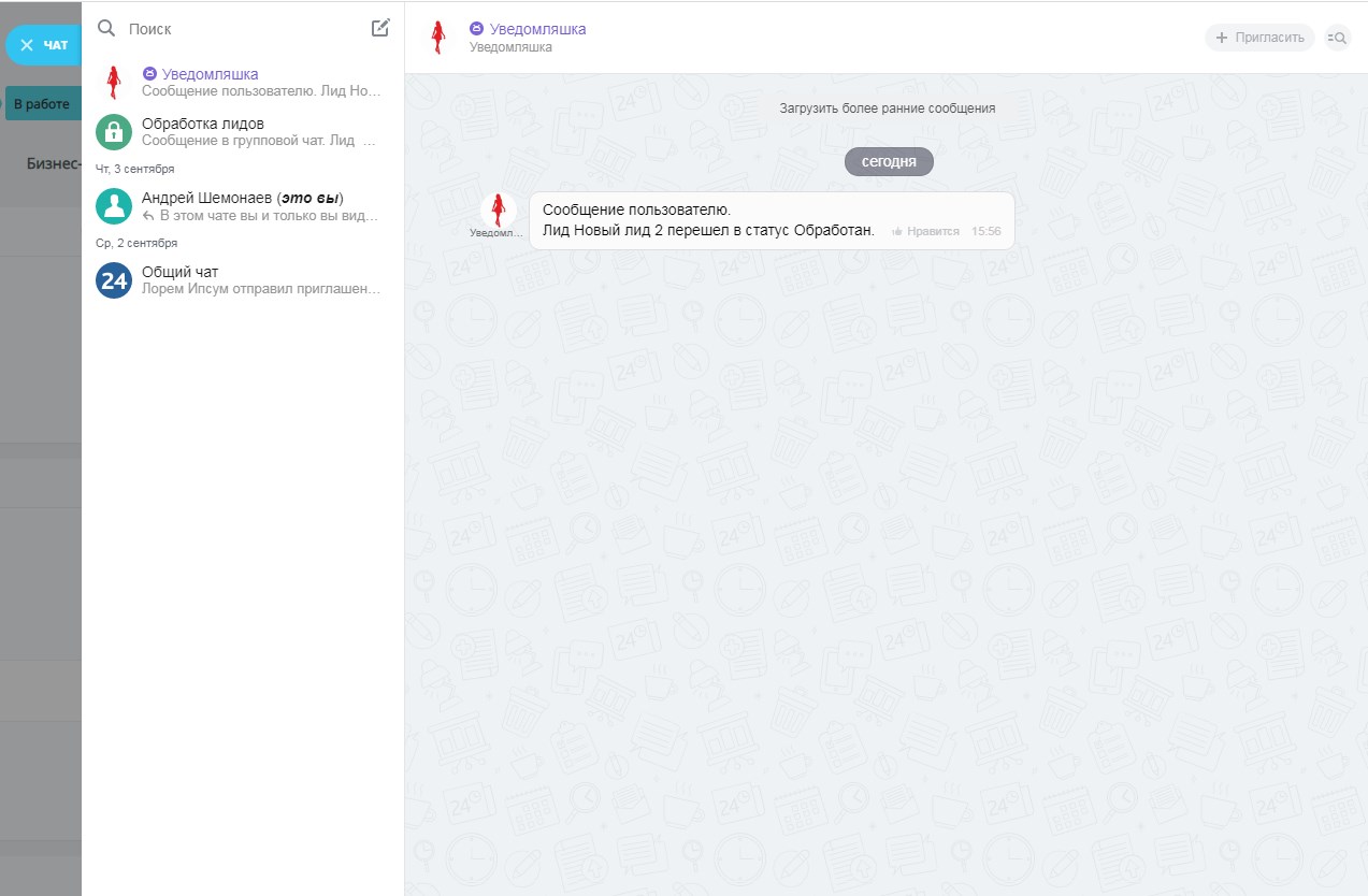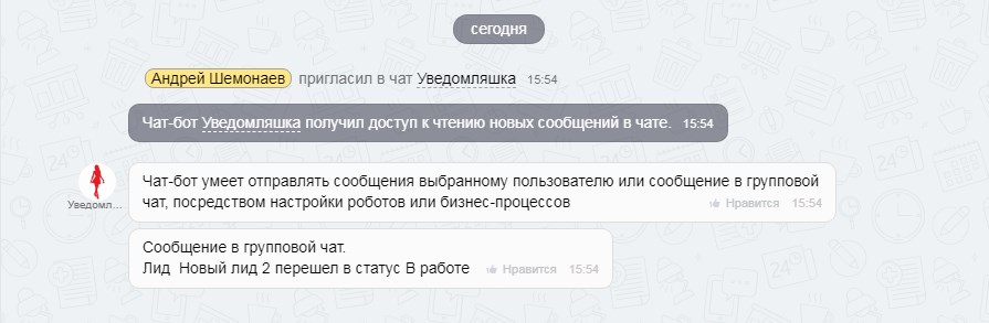 Позволяет в удобном виде получать уведомления от чат-бота. Доступно использование роботов и бизнес-процессов. Чат-бот умеет отправлять сообщения выбранному пользователю или сообщение в групповой чат.