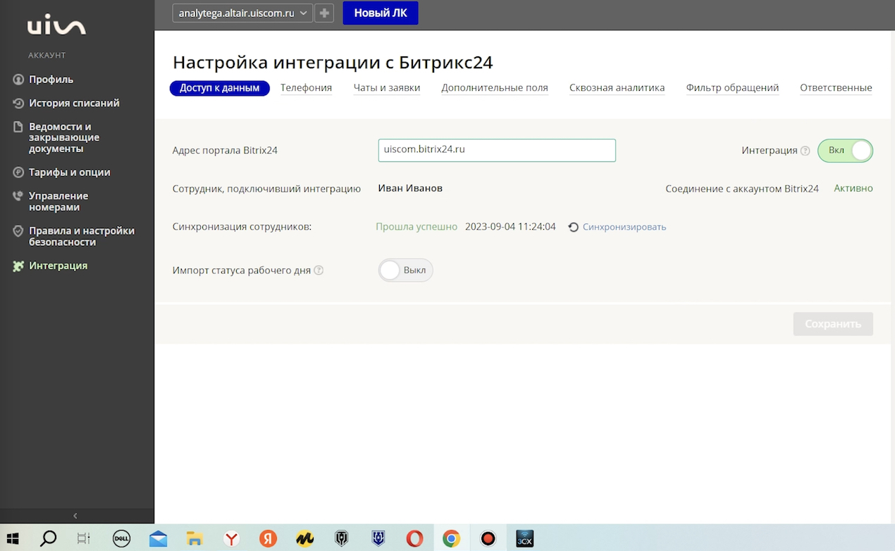- Войдите в личный кабинет UIS с паролем администратора в раздел Аккаунт – Интеграции – Битрикс24 и нажмите Подключить.