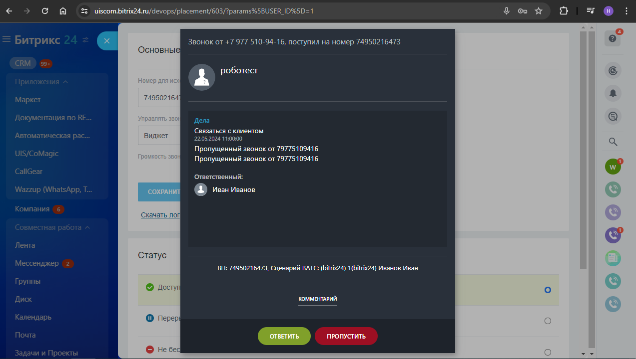 если сотрудник отошел на перерыв, звонок пойдет на следующего менеджера в соответствии с настройкой сценария SIP-телефонии в Битрикс24, и вызовы клиентов примут коллеги
