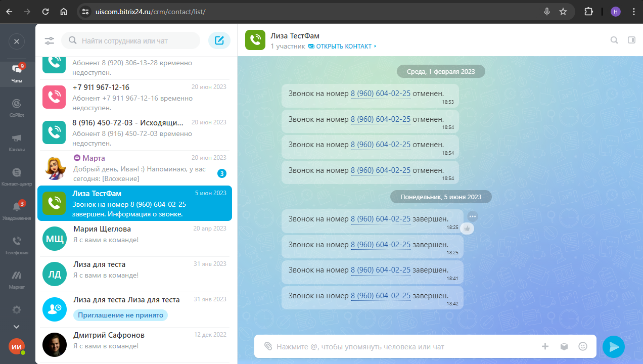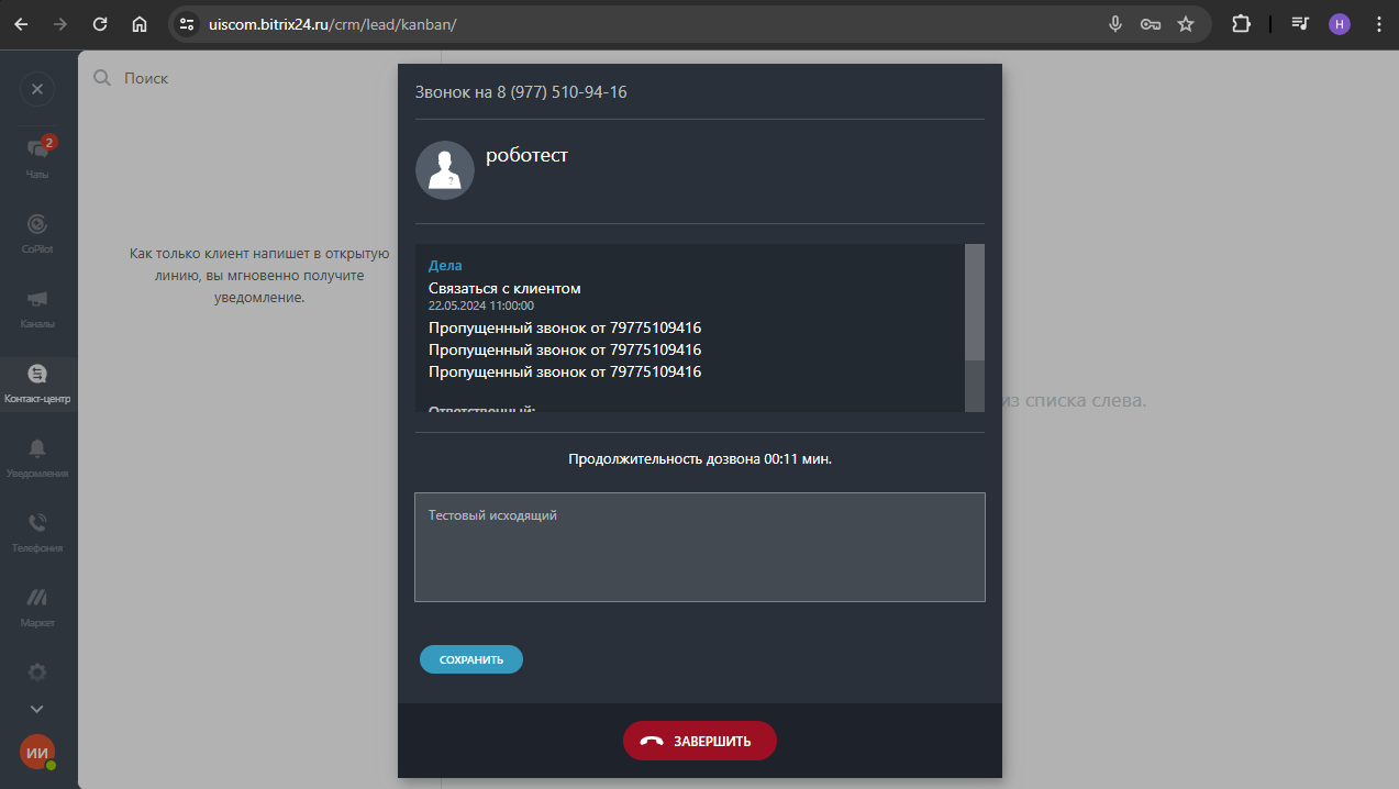 Контроль и прозрачность: записи разговоров и чаты с клиентами благодаря интеграции подгружаются в Bitrix, в результате вы контролируете все коммуникации в одном окне