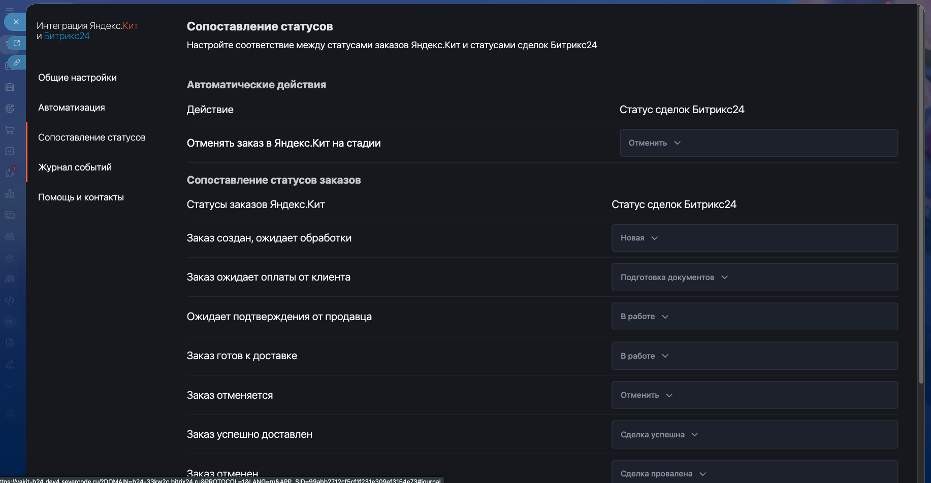 Сопоставление статусов: укажите соответствие между статусами сделок/лидов в Битрикс24 и статусами заказов в Яндекс.KIT
