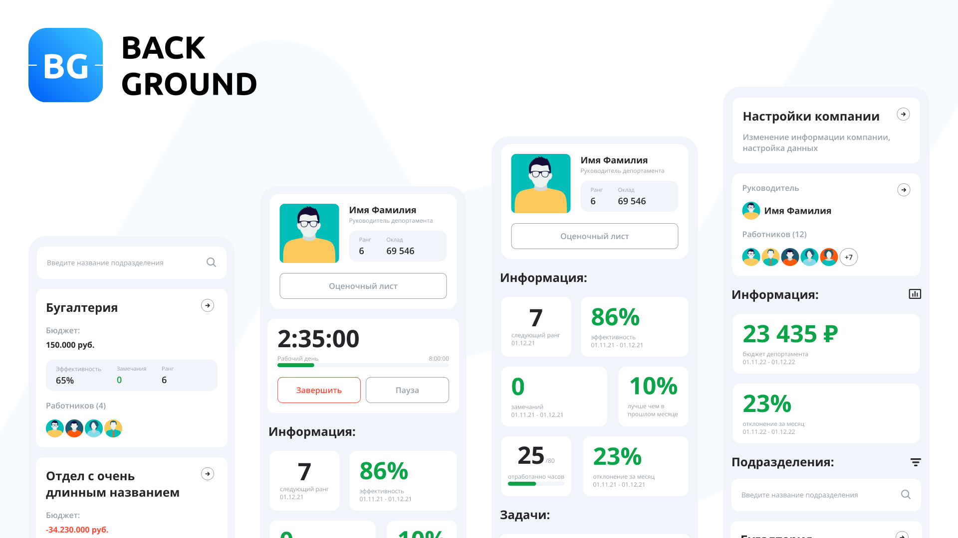 Бэкграунд (BG) приложение позволяет организовывать, мотивировать и контролировать работу компании и каждого отдельного сотрудника, из любой точки мира. Приложение в несколько раза эффективнее любой из общепринятых систем оплаты и стимулирования труда, полностью соответствует трудовому кодексу РФ