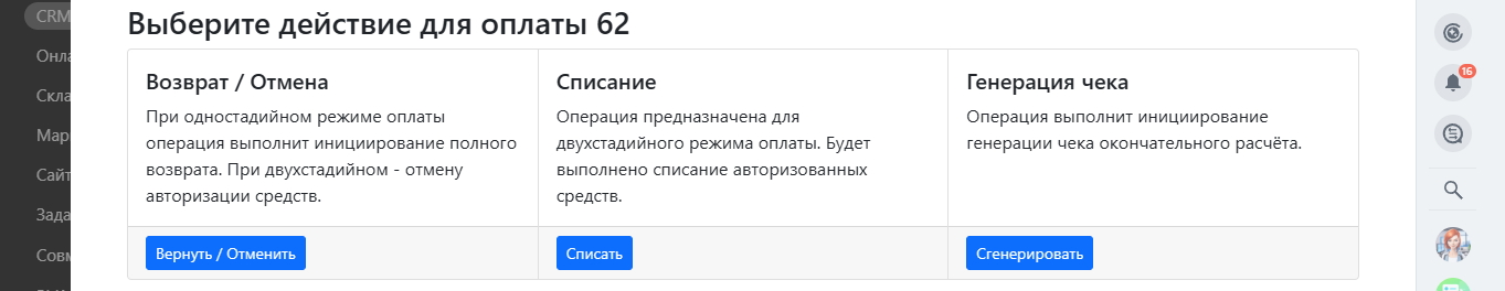 - Приём платежей по счетам, сделкам, предложениям и лидам.
