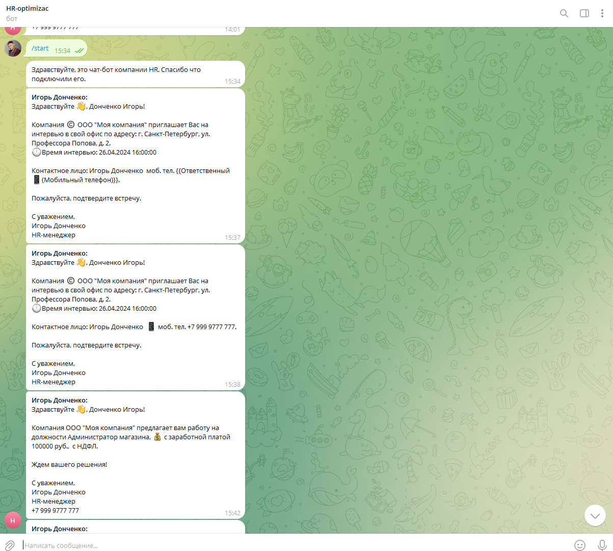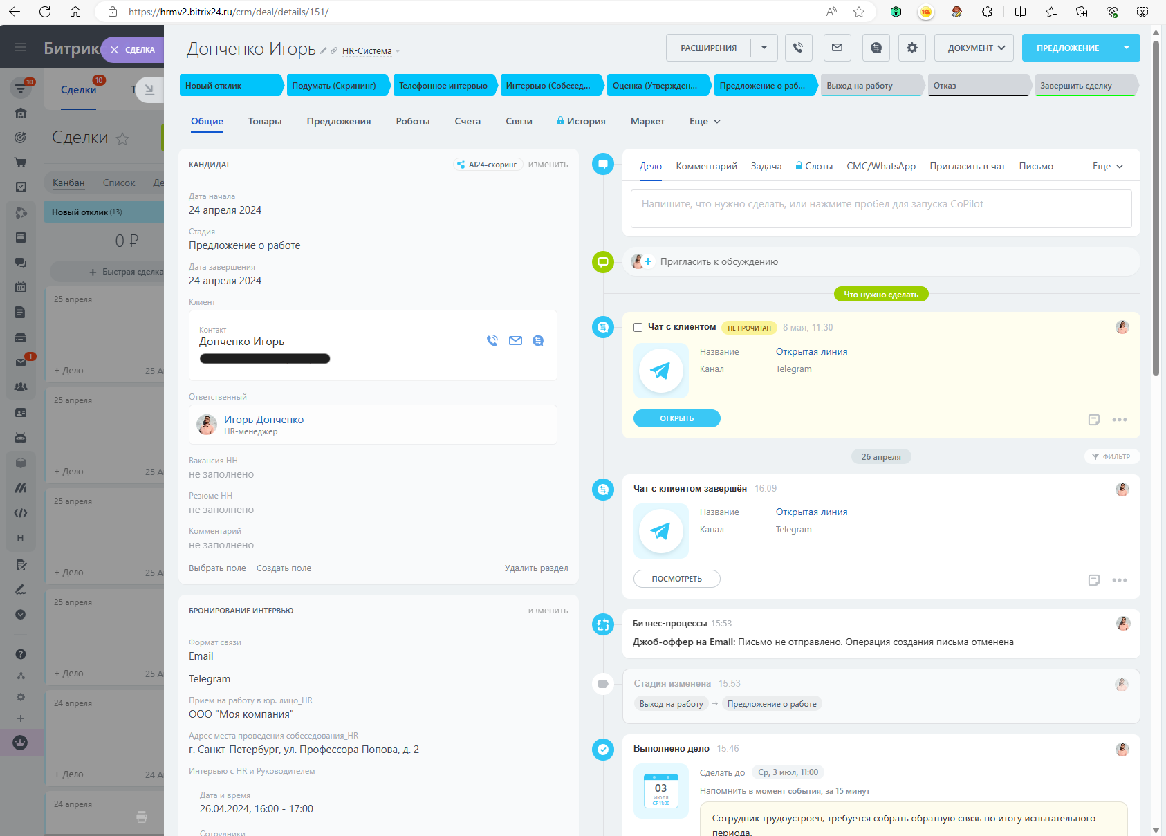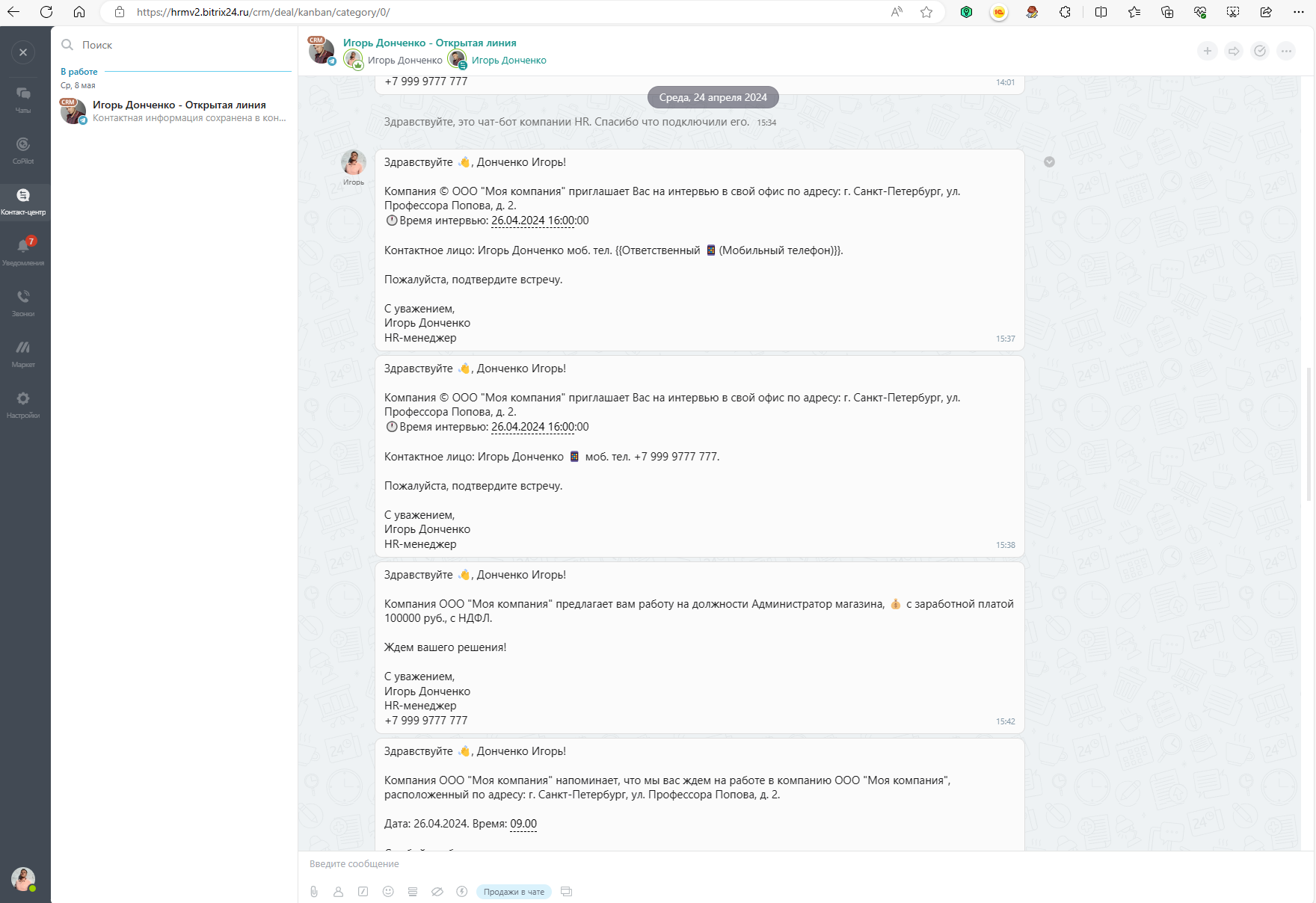 - Телефонное интервью – устанавливаем контакт, отправляем сообщения соискателю, подключение к Telegram.