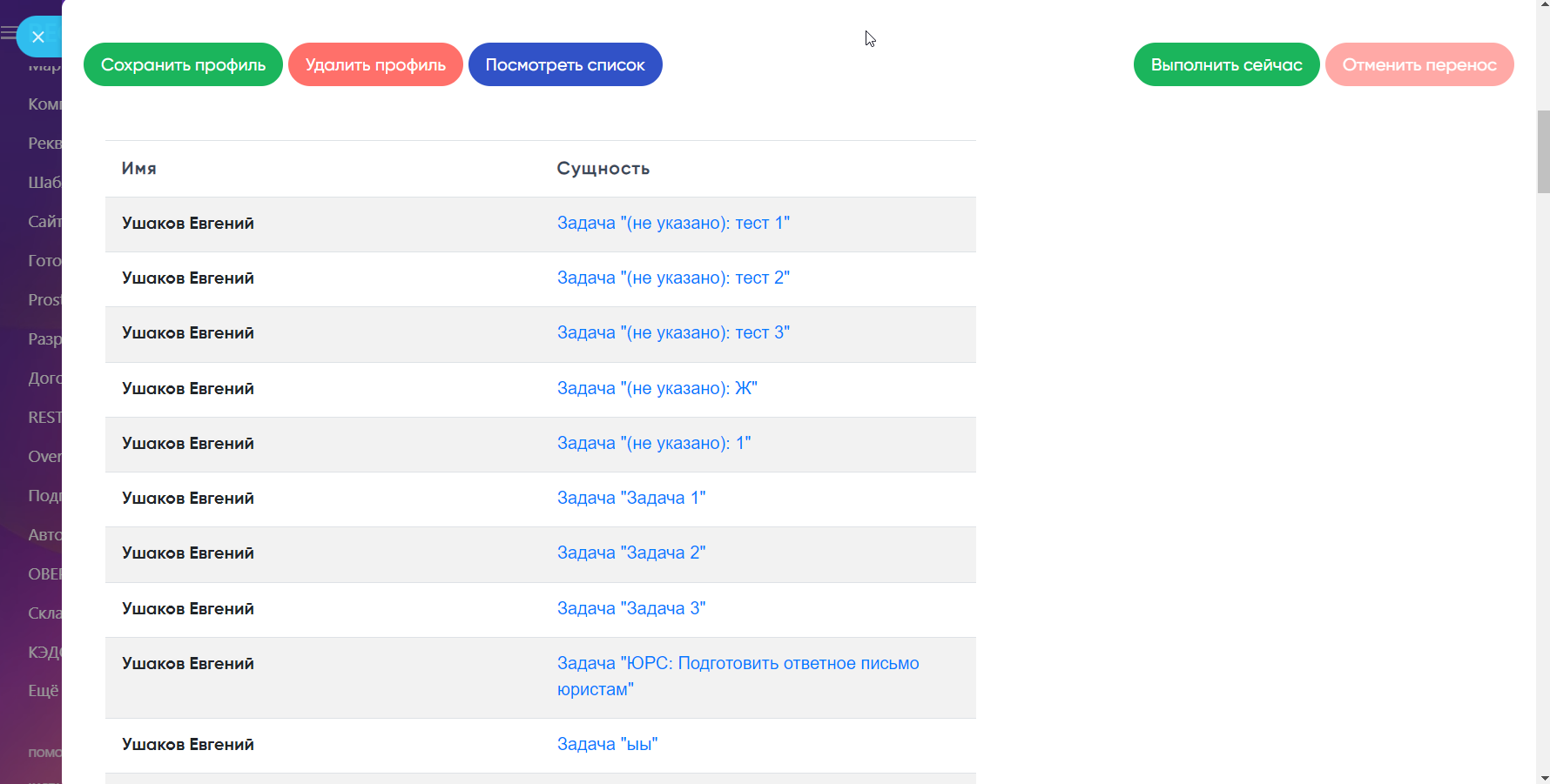 - Назначение на одного сотрудника. Все задачи и клиенты разом передаются одному заместителю — идеально для передачи дел внутри отдела или временного замещения.